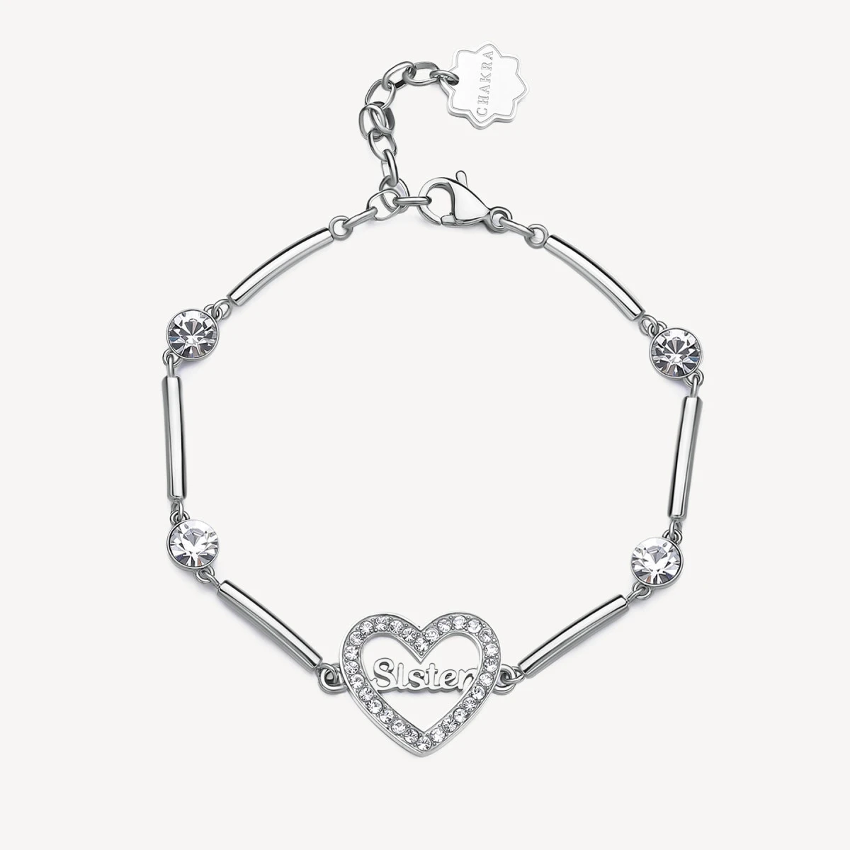 Dámsky náramok z kolekcie Chakra so srdiečkom, nápisom SISTER a prvotriednymi kryštálmi je vyrobený z chirurgickej ocele. Povrch náramku je leštený. Zapínanie náramku je karabínové a jeho dĺžka je 18,5 cm.