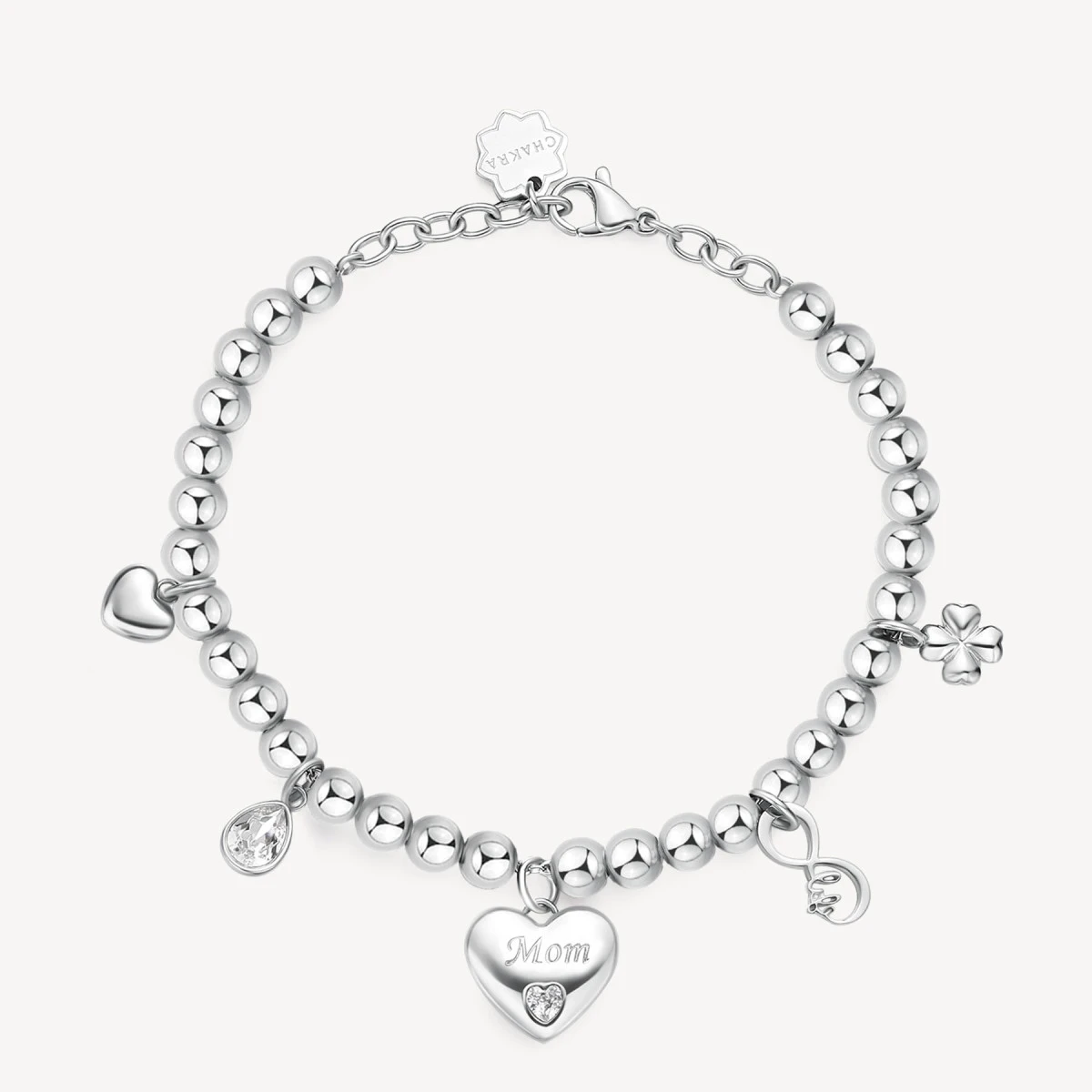 Dámsky náramok z kolekcie Chakra zdobený príveskami, prvotriednymi kryštálmi a s rytinou MOM je vyrobený z chirurgickej ocele. Povrch náramku je leštený. Zapínanie náramku je karabínové a jeho dĺžka je 18,5 cm.