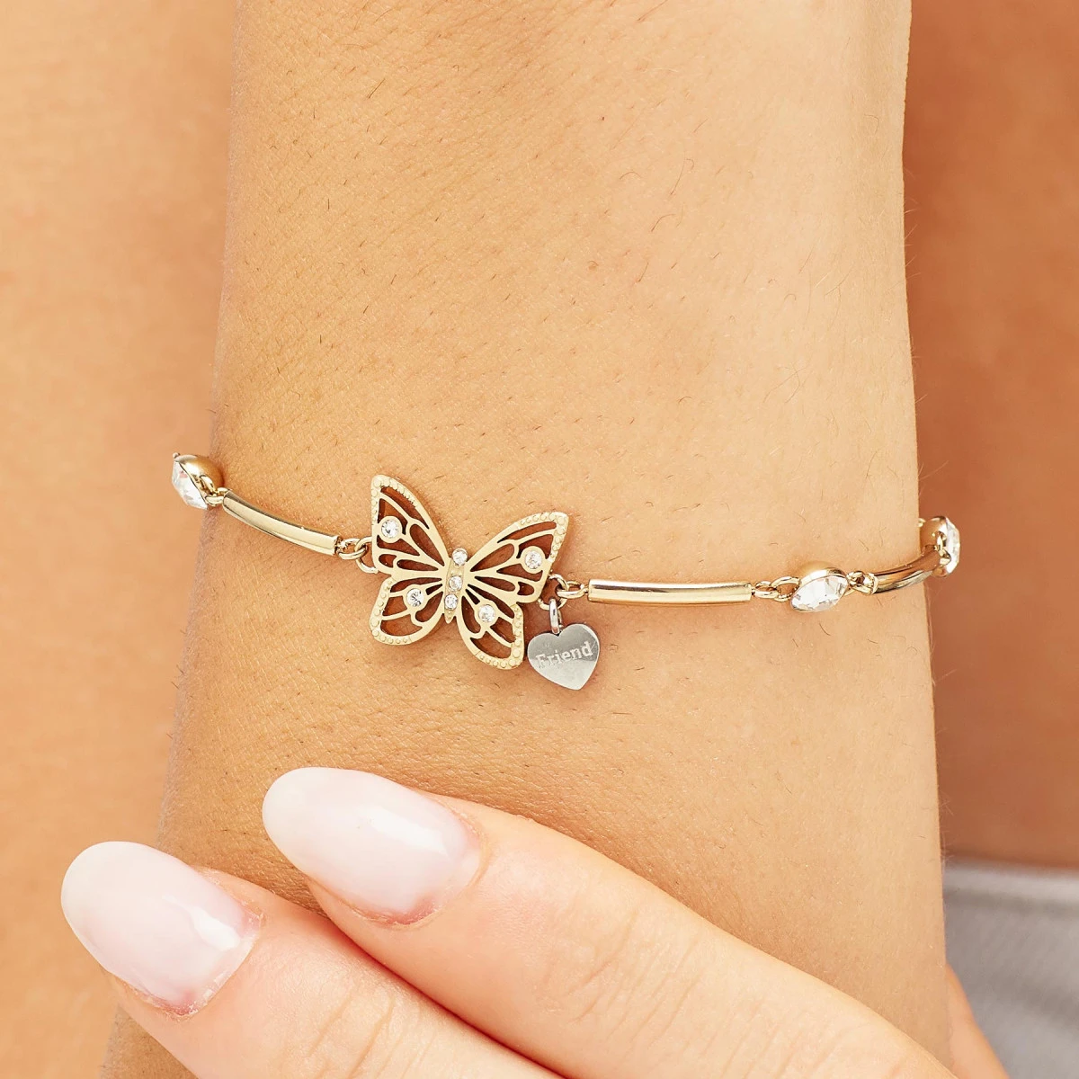 Dámsky náramok s príveskom v tvare motýľa s kryštálmi z kolekcie Chakra je vyrobený z chirurgickej ocele. Povrch náramku je pozlátený technológiou PVD. Zapínanie náramku je karabínové a jeho dĺžka je 18,5 cm.