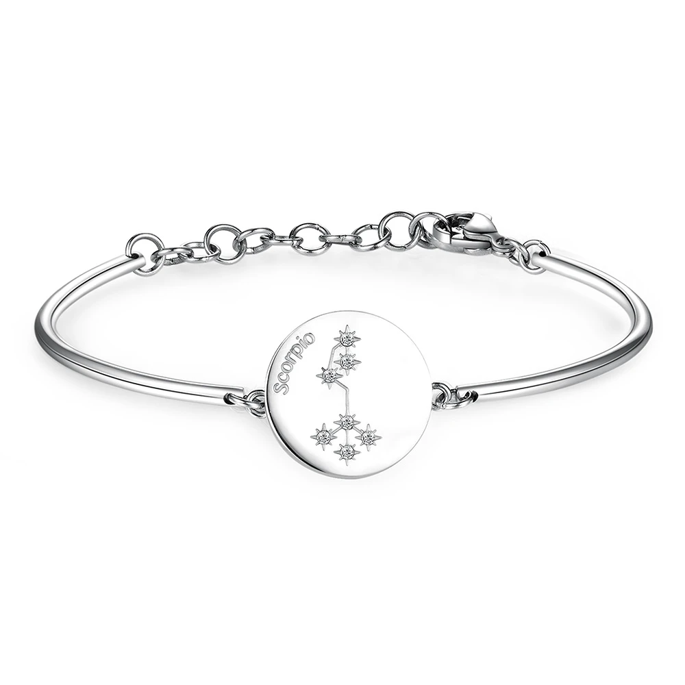Náramok z chirurgickej ocele Brosway so znamením Škorpión (24.10-22.11). Povrch náramku je leštený. Hviezdy zo súhvezdia sú zastúpené žiarivými kryštálmi. Ozdobná časť náramku so znamením má priemer 17 mm. Náramok má karabínové zapínanie. Dĺžku náramku je možné plynule nastaviť v rozmedzí 15-18 cm.