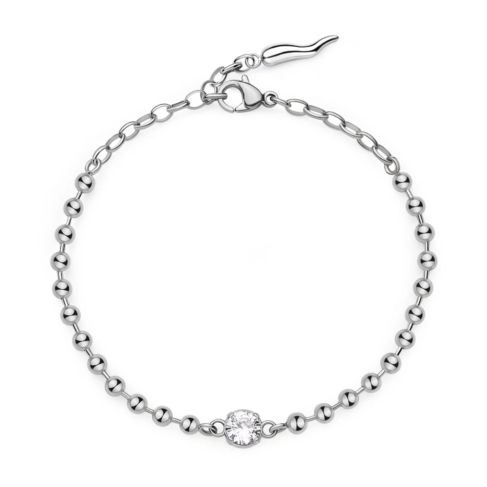 Dámsky náramok z chirurgickej ocele zdobený čírym zirkónom. Povrch náramku je leštený. Náramok je dlhý 18cm, zapínanie náramku je karabínové.
