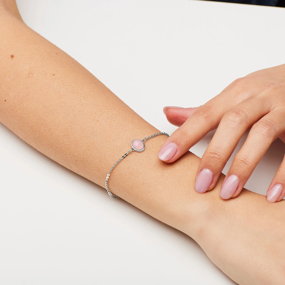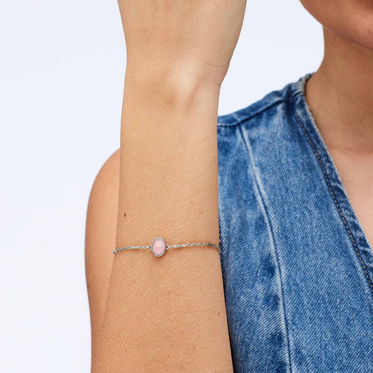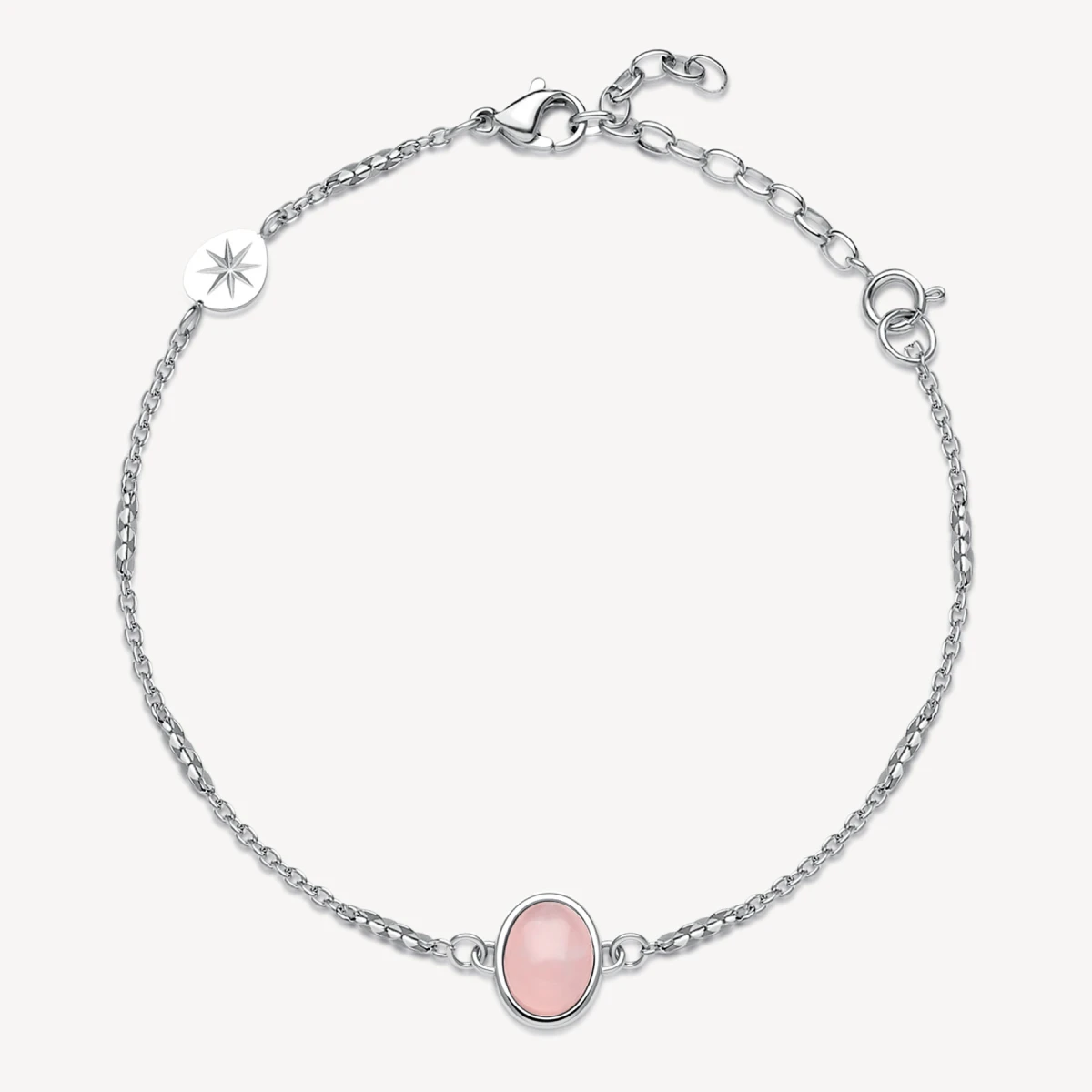 Náramok z chirurgickej ocele. Povrch náramku je leštený. Ozdoba náramku je osadená prírodným minerálom ruženín. Zapínanie náramku je karabínové, dĺžka náramku 20cm.
