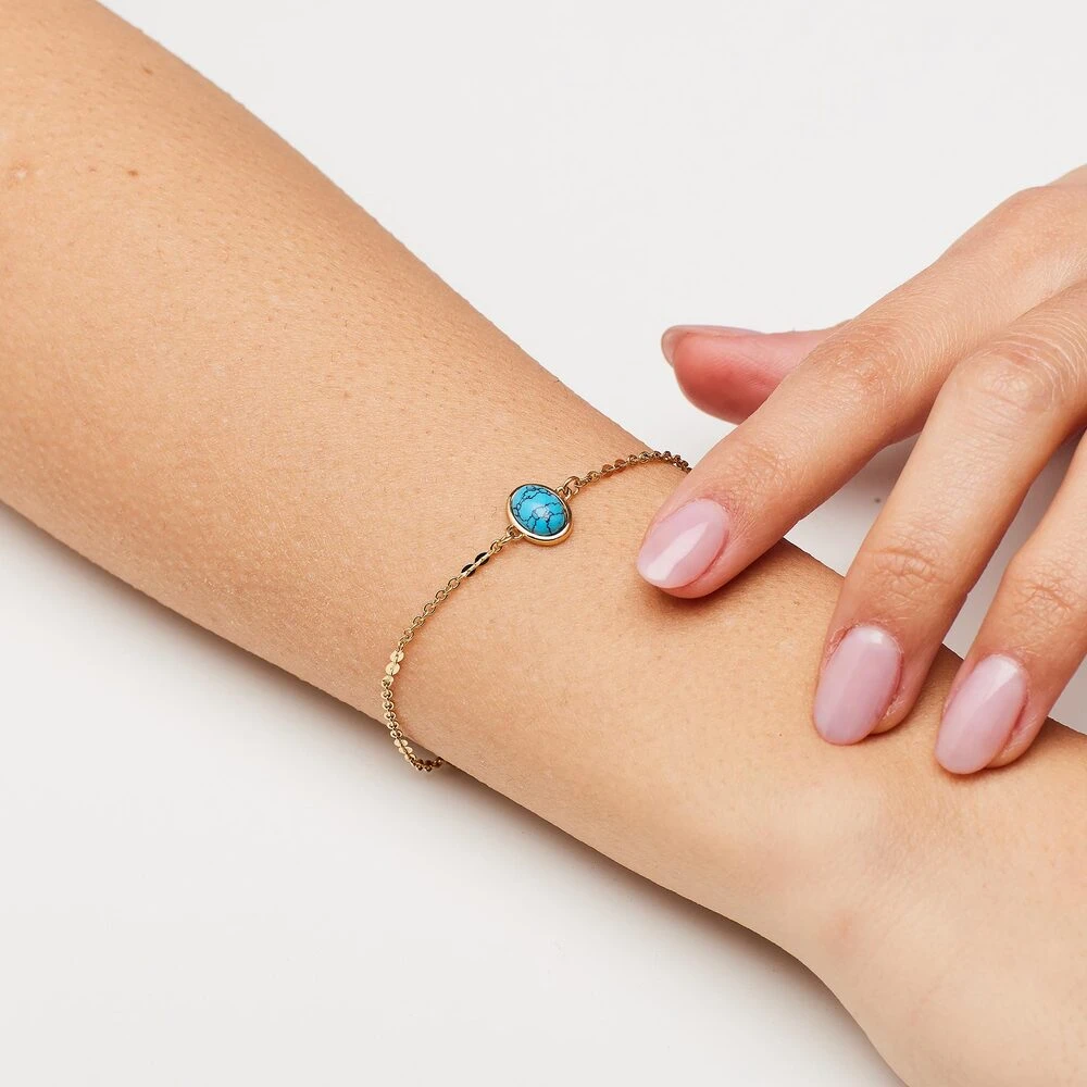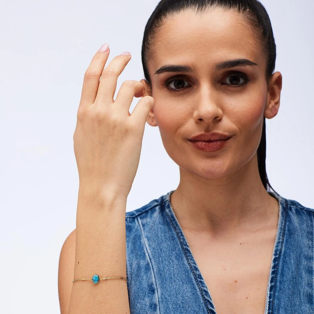 Náramok z chirurgickej ocele s pozláteným povrchom. Náramok je ozdobený rekonštituovaným tyrkysom. Zapínanie náramku je karabínové. Elegantný dámsky náramok s tyrkysom, ktorý je považovaný za kameň ochrany, pokoja a ženskej sily.