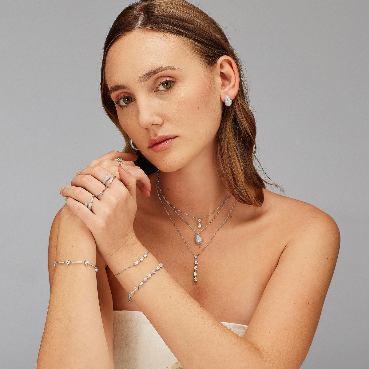 Strieborný náramok s kamienkami. Náramok je vyrobený za striebra 925/1000 a osadený prvotriednymi zirkónmi. Povrch náramku je porhodiovaný. Nanesené ródium dodáva šperku jasnú baru s leskom, zvyšuje odolnosť náramku proti poškriabaniu a zabezpečuje dlhodobý bezchybný vzhľad šperku. Náramok je dlhý 18,5 cm, zapínanie náramku je karabínové.