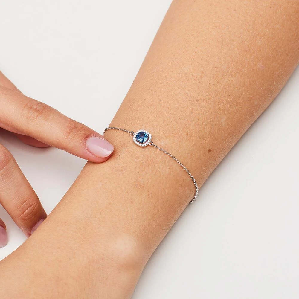 Strieborný náramok s kamienkami. Náramok je vyrobený zo striebra 925/1000, osadený prvotriednymi zirkónmi. Povrch náramku je porhodiovaný. Nanesené ródium dodáva šperku jasnú baru s leskom, zvyšuje odolnosť náramku proti poškriabaniu a zabezpečuje dlhodobý bezchybný vzhľad šperku. Náramok je dlhý 18 cm, zapínanie náramku je karabínové.