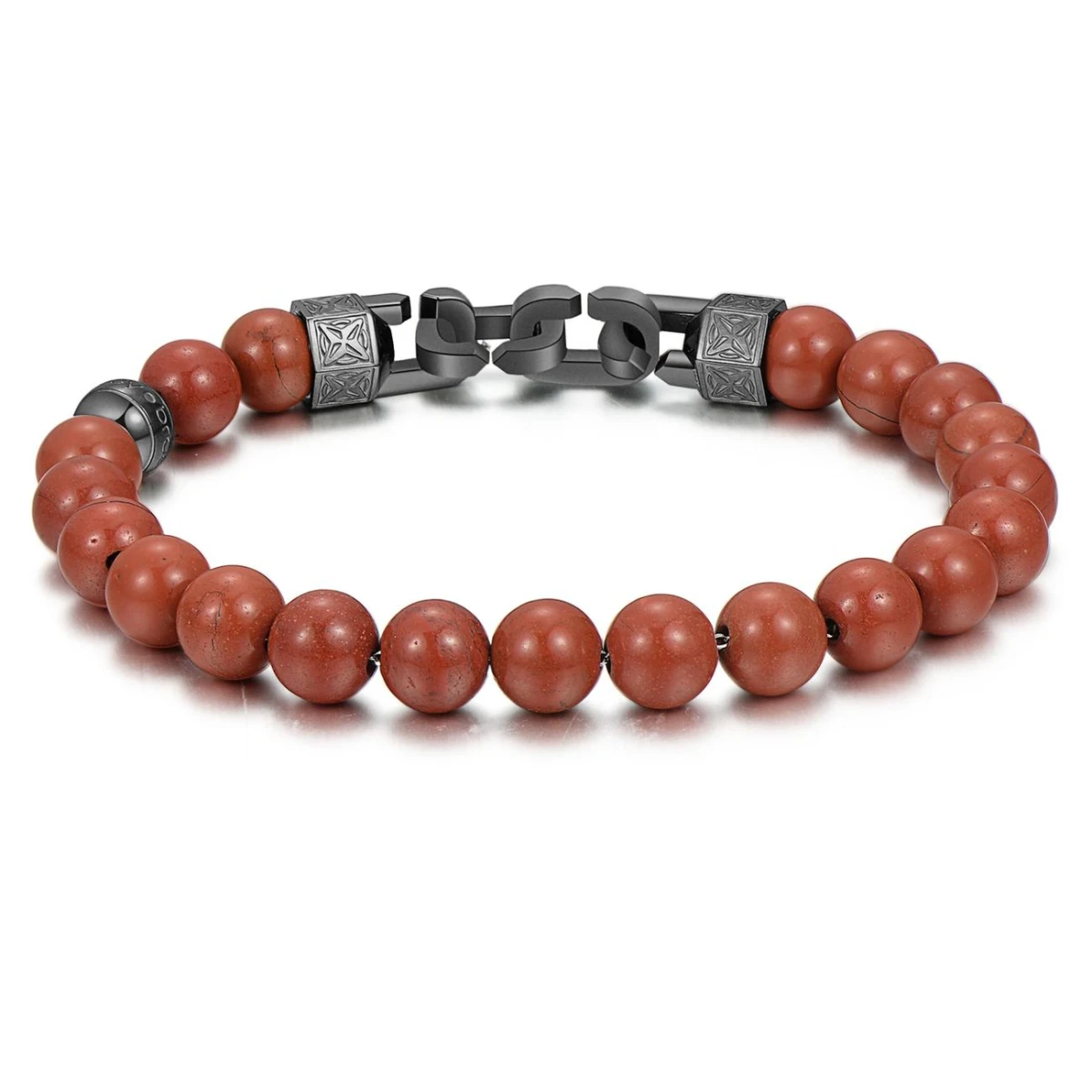 Moderné náramok Brosway z kolekcie Shanti. Náramok je kombinácia minerálu červený jasper a chirurgickej ocele. Korálky majú priemer 8 mm. Dĺžka náramku 22 cm.