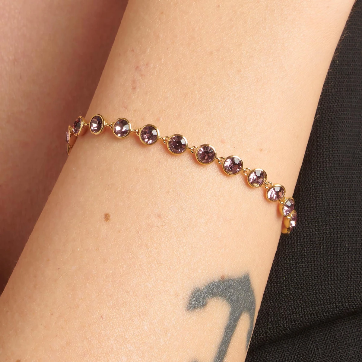Dámsky náramok z chirurgickej ocele zdobený kryštálmi. Povrch náramku je leštený pozlátený technológiou PVD. Náramok je dlhý 18cm, zapínanie náramku je karabínové.