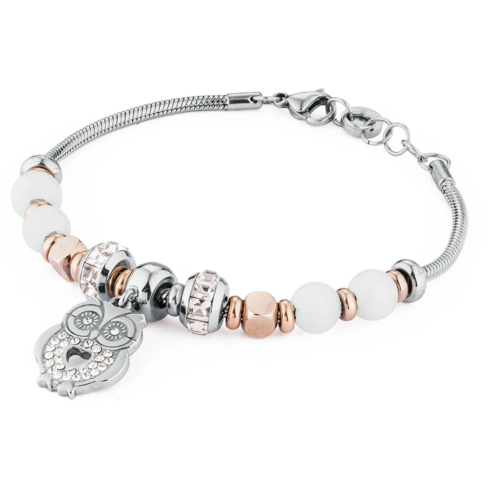 Náramok Brosway z kolekcie Tres je vyrobený z chirurgickej ocele a je čiastočne pozlátený ružovou technológiou PVD. Náramok je ozdobený korálkami netrifu, kryštálmi a príveskom sovy. Zapínanie náramku je na karabínku a jeho dĺžka je 20 cm.