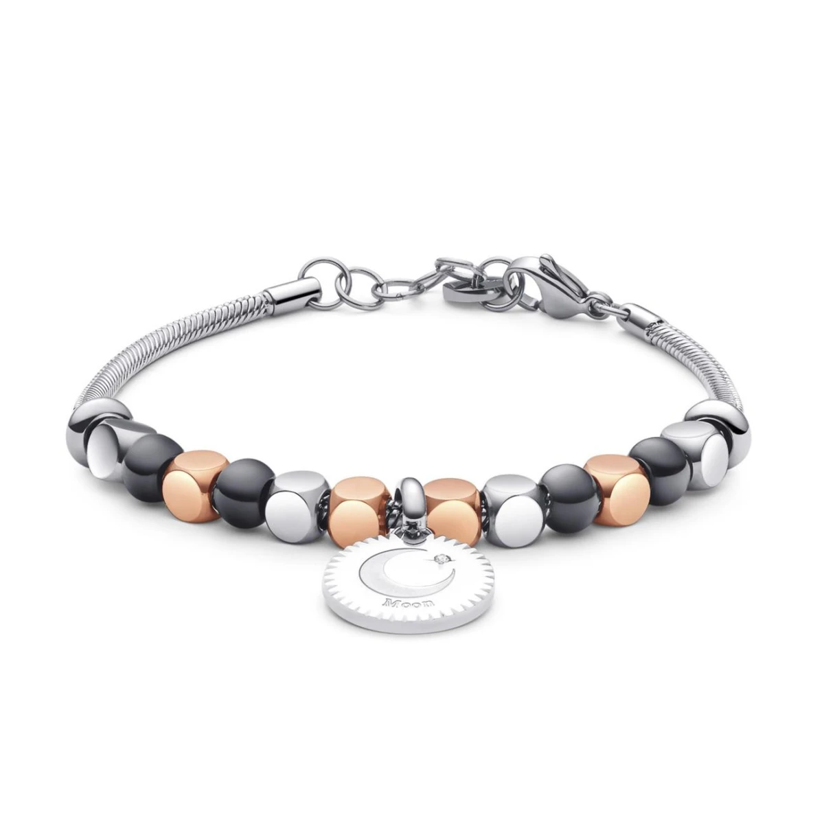 Náramok na ruku Brosway z chirurgickej ocele 316L. Náramok má karabínové zapínanie. Povrch korálok je upravený technológiou PVD na farbu ružového zlata a čierne. Priemer náramku 55 mm.