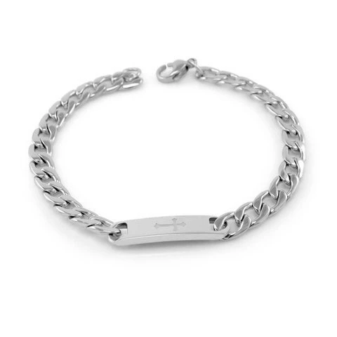 Náramok z chirurgickej ocele. Povrch náramku je leštený, šírka 6mm. Na oceľové doštičke je rytina kríža. Náramok sa zapína pomocou karabíny. Všetky oceľové šperky sú odolné proti poškodeniu, hypoalergénne a farebne stále.