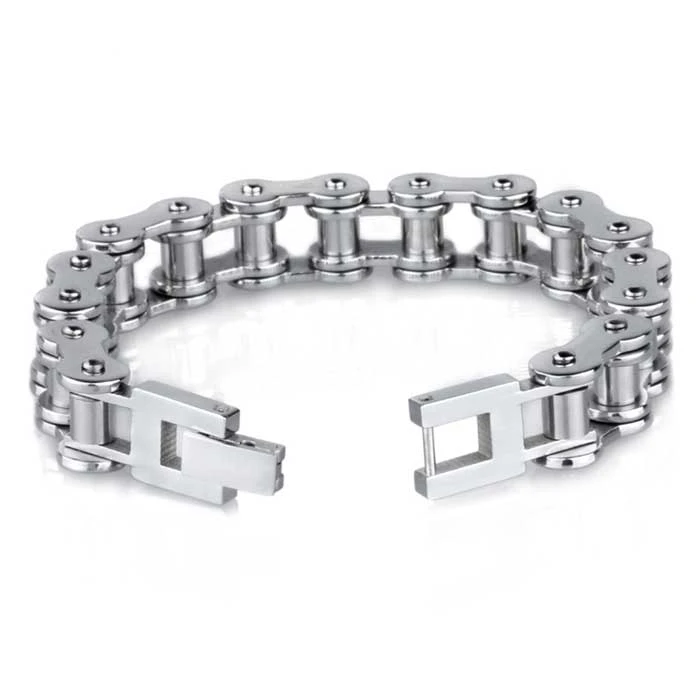 Náramok pre motorkárov z chirurgickej ocele napodobňujúci motocyklový reťaz. Povrch náramku je leštený. Náramok je dlhý 21cm, šírka náramku 10mm.