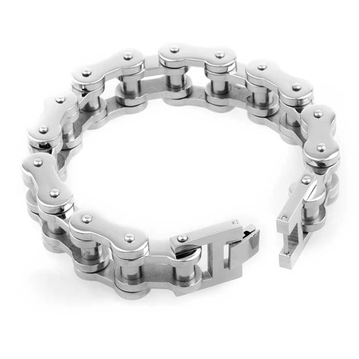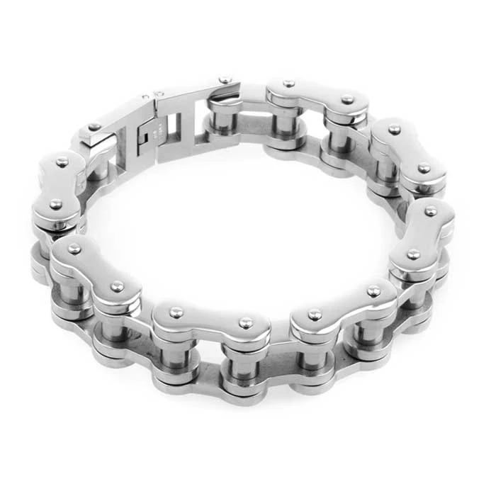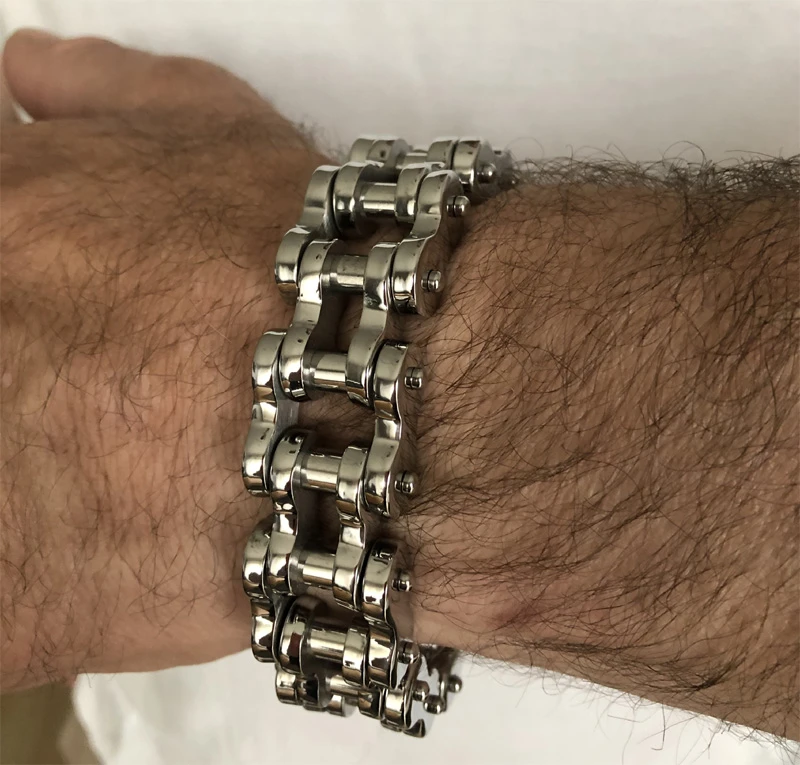 Oceľový náramok na ruku napodobňujúci motocyklový reťaz. Ako všetky šperky z chirurgickej ocele je tiež tento oceľový náramok odolný proti poškodeniu, nemení farbu, neoxiduje a nevyvoláva alergické reakcie.