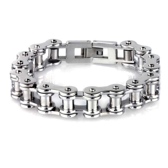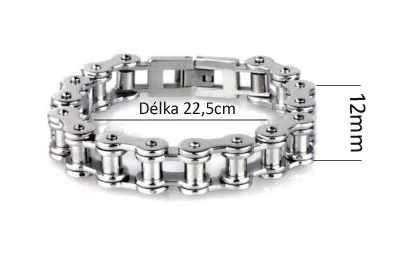 Náramok pre motorkárov z chirurgickej ocele napodobňujúci motocyklový reťaz. Povrch náramku je leštený. Náramok je dlhý 22,5cm, šírka náramku 12mm.