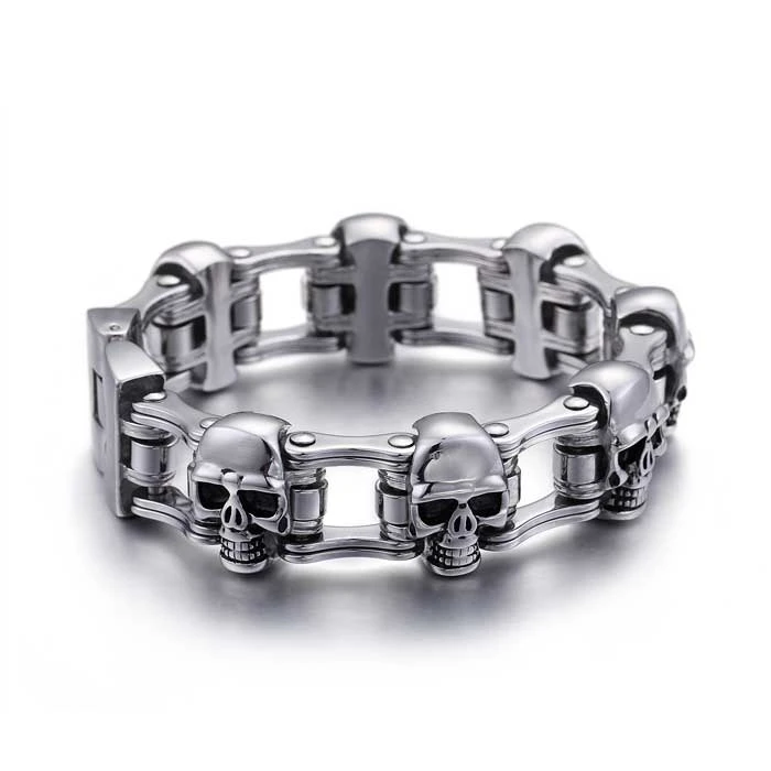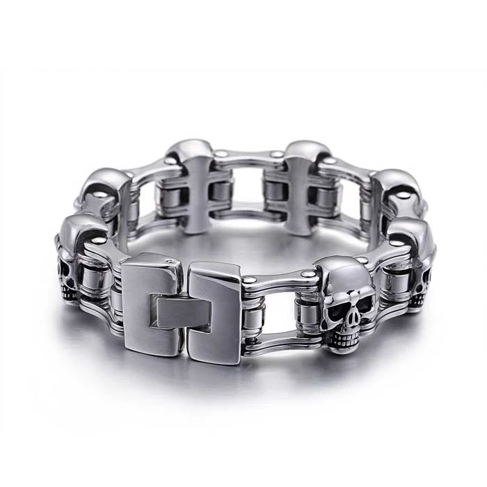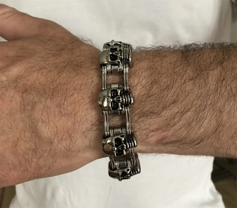 Náramok z chirurgickej ocele motocyklový reťaz s lebkami. Povrch náramku je leštený. Masívny náramok reťaz na ruku široký 22mm, hrúbka náramku 12mm, dĺžka 23cm.