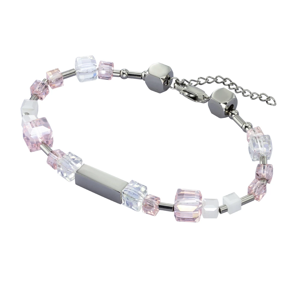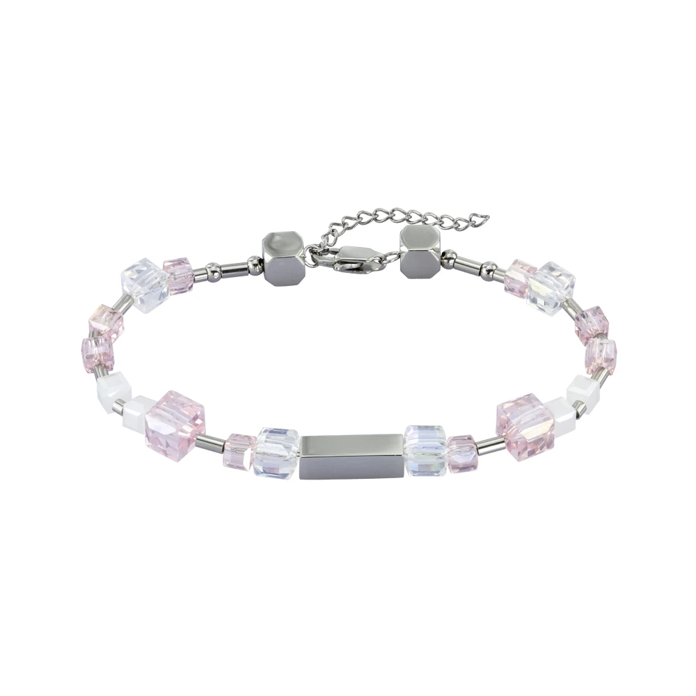 Dámsky náramok z chirurgickej ocele a hranatých sklenených korálikov. Povrch oceľových častí je leštený. Korálky sú široké 7mm, 6mm a 5mm. Zapínanie náramku je karabínové. Dĺžku náramku je možné nastaviť v rozmedzí 18-21cm.