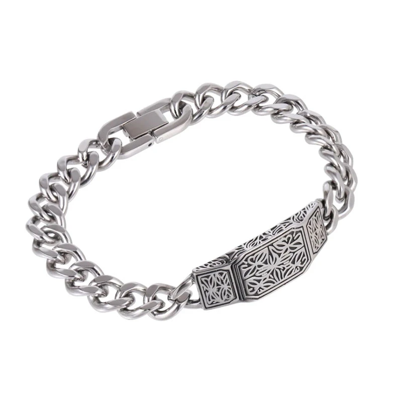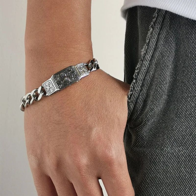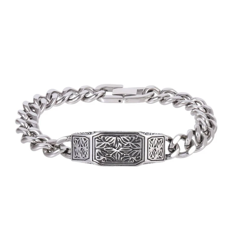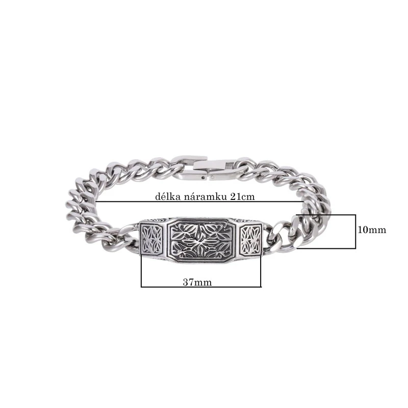 Pánsky náramok na ruku z chirurgickej ocele. Povrch náramku je leštený, vzor na doštičke je zvýraznený čiernou farbou. Vďaka použitému materiálu je náramok odolný proti poškriabaniu a nevyvoláva alergické reakcie, bez obáv ho môžu nosiť osoby s citlivou pokožkou. Náramok je dlhý 21 cm.