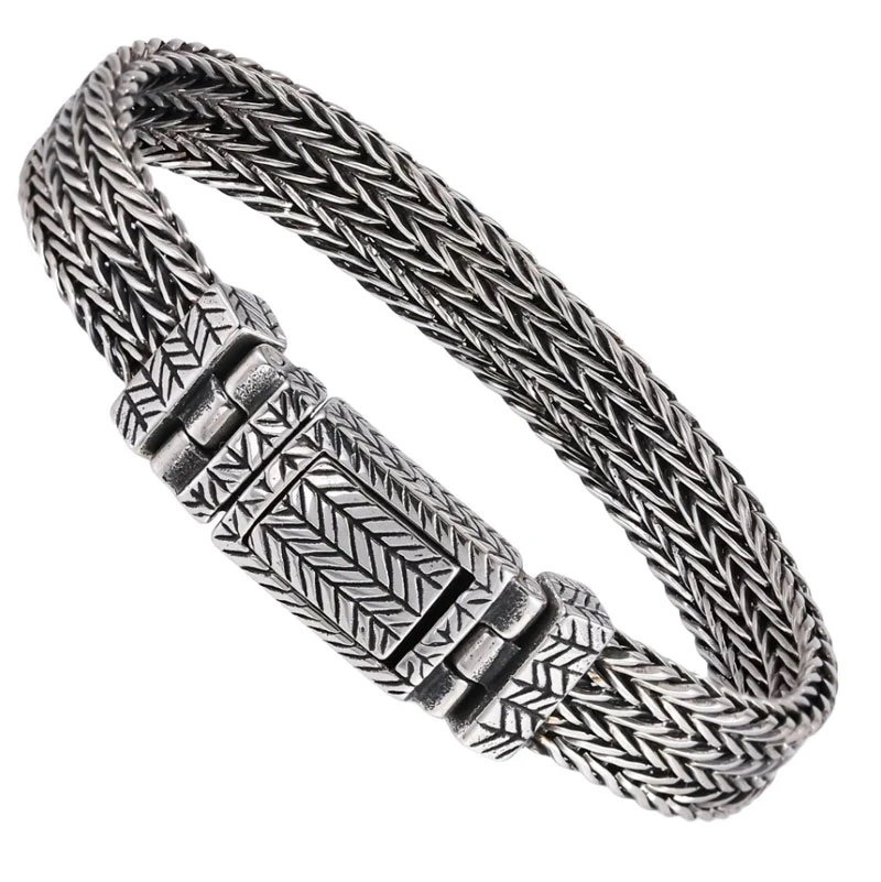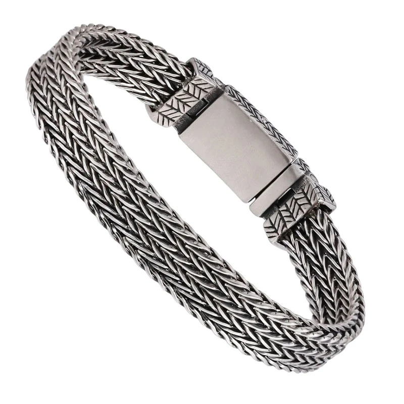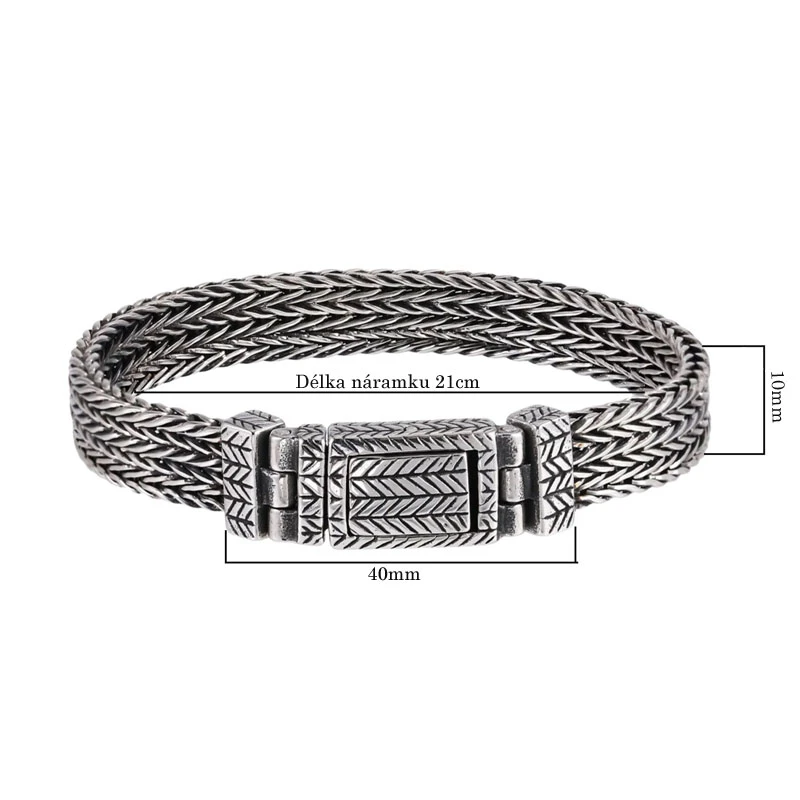 Pánsky náramok na ruku z chirurgickej ocele. Povrch náramku je leštený s čiernou patinou. Vďaka použitému materiálu je náramok odolný proti poškriabaniu a nevyvoláva alergické reakcie, bez obáv ho môžu nosiť osoby s citlivou pokožkou. Náramok je dlhý 21 cm, široký 10 mm, zapínanie náramku je na klip. Rozmery náramku nájdete zobrazené na podpornej fotografii.