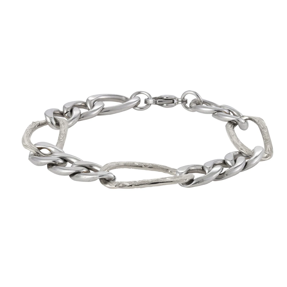 Náramok na ruku z chirurgickej ocele. Náramok je klasický vzor Figaro, ktorý nikdy nevyjde z módy. Povrch náramku je leštený, oválne očká majú gravírovaný povrch. Zapínanie náramku je karabínové. Náramok je dlhý 21cm, šírka 12mm. Na prianie je možné dĺžku náramku zadarmo skrátiť.