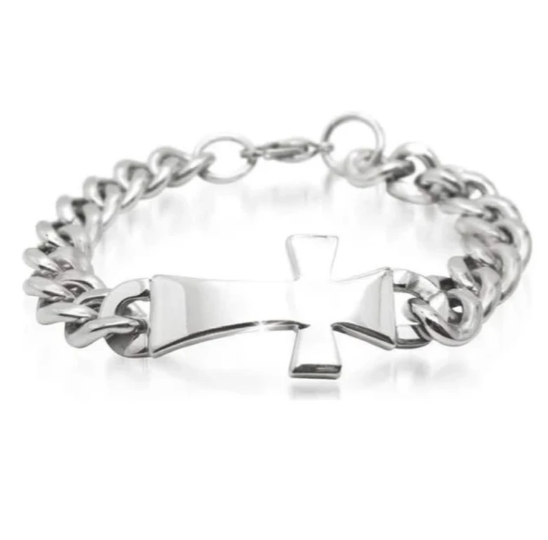 Oceľový náramok s krížom, ktorý predstavuje symbol viery a odhodlania. Povrch náramku je leštený. Kríž má rozmer 50x20mm. Retiazkové časti náramku sú široké 11mm. Náramok z chirurgickej ocele dlhý 21cm. Dĺžku náramku je možné na prianie zadarmo skrátiť.