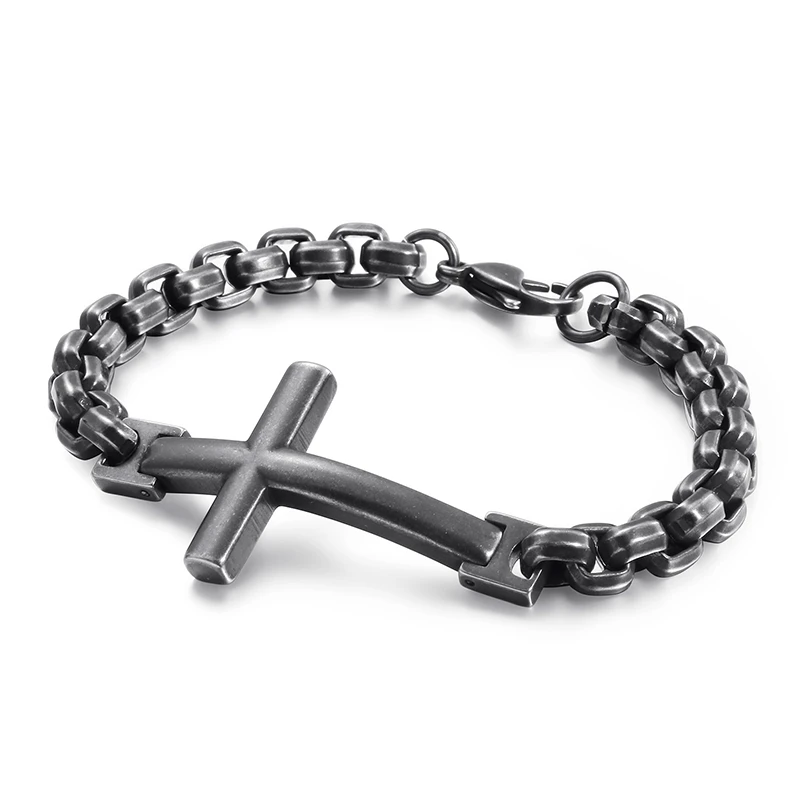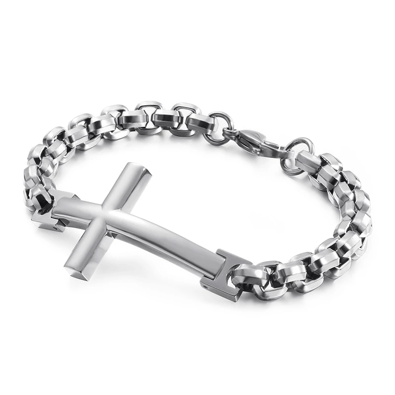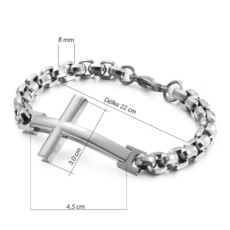 Oceľový náramok na ruku s krížom. Náramok má leštený povrch. Dĺžka náramku 22 cm, rozmer kríža 4,5 x 3,0 cm, priemer retiazky 8 mm. Náramok má karabínové zapínanie.