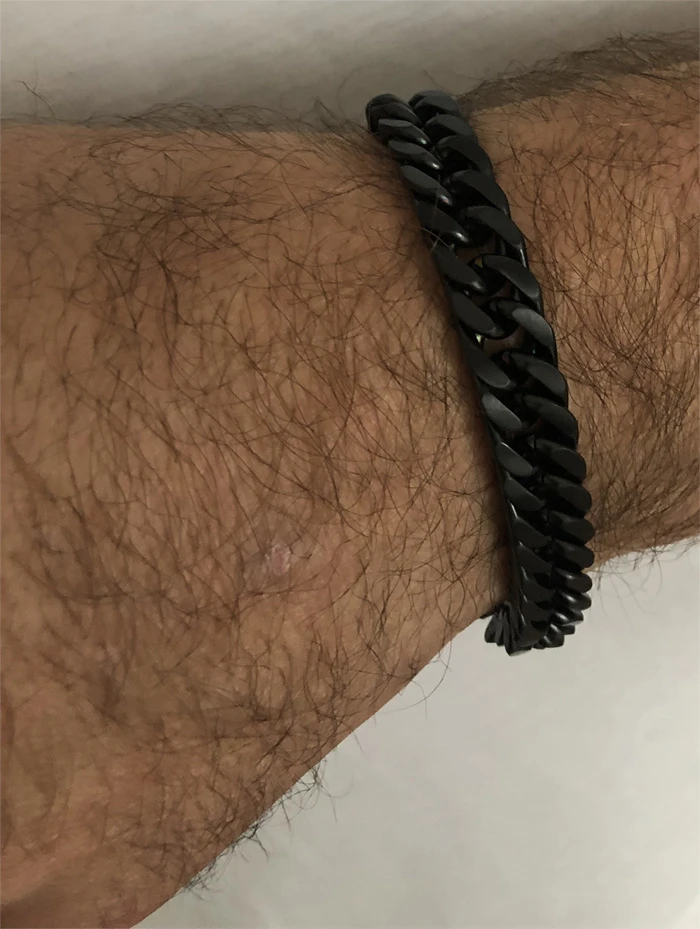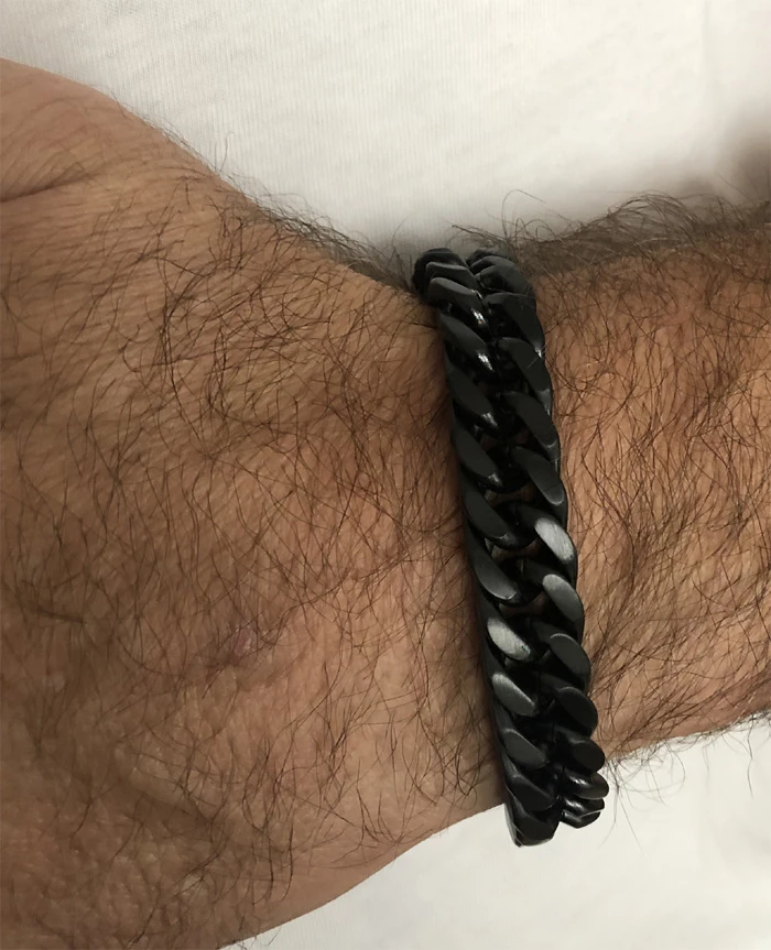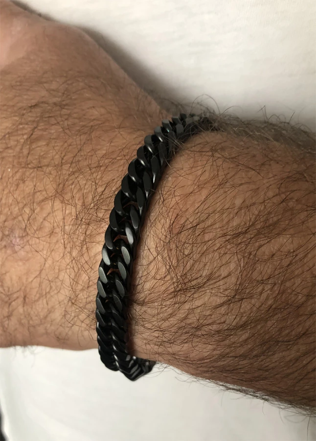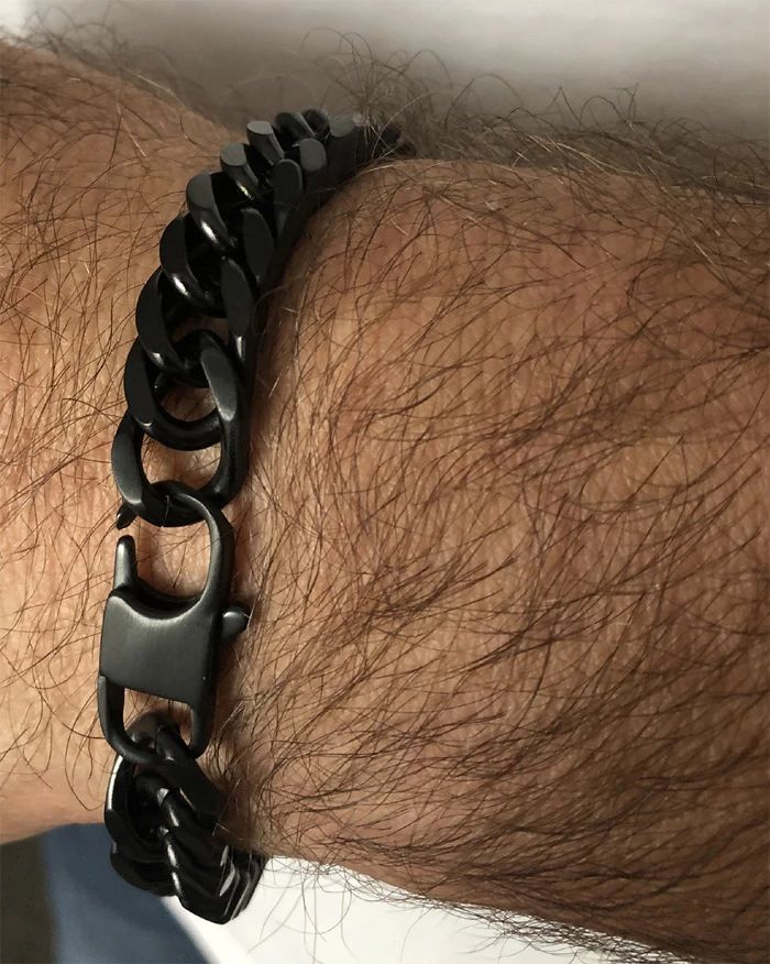 Náramok na ruku s čiernym povrchom upraveným čiernou farbou PVD. Dĺžka náramku 21,5cm, šírka náramku 12mm. Zapínanie náramku je karabínové, dĺžku náramku možno na želanie bezplatne skrátiť.