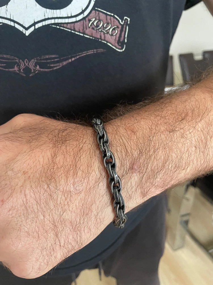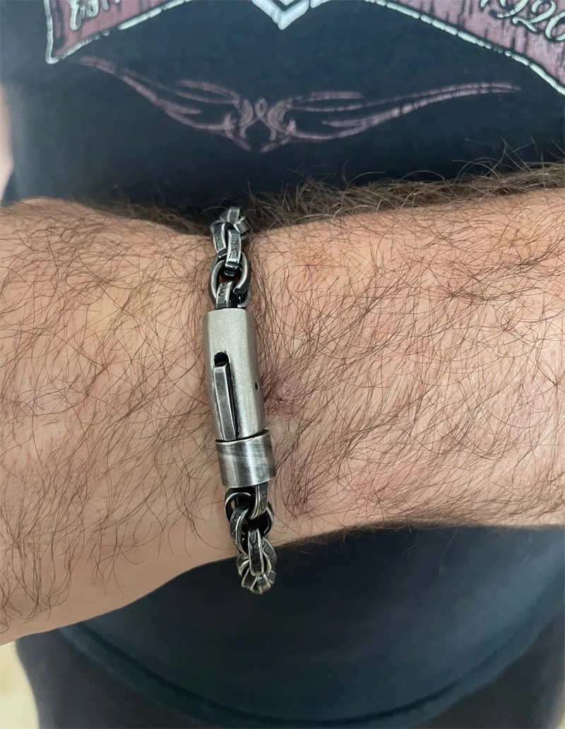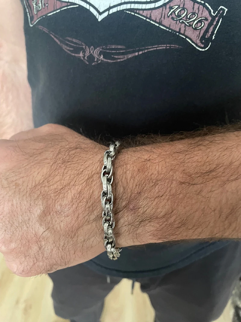 Náramok na ruku z chirurgickej ocele. Náramok tvoria navzájom prepletené oválne očká so vzorom na povrchu. Priemer náramku 10mm. Zapínanie náramku je na bajonet. Dĺžka náramku 22,5cm.