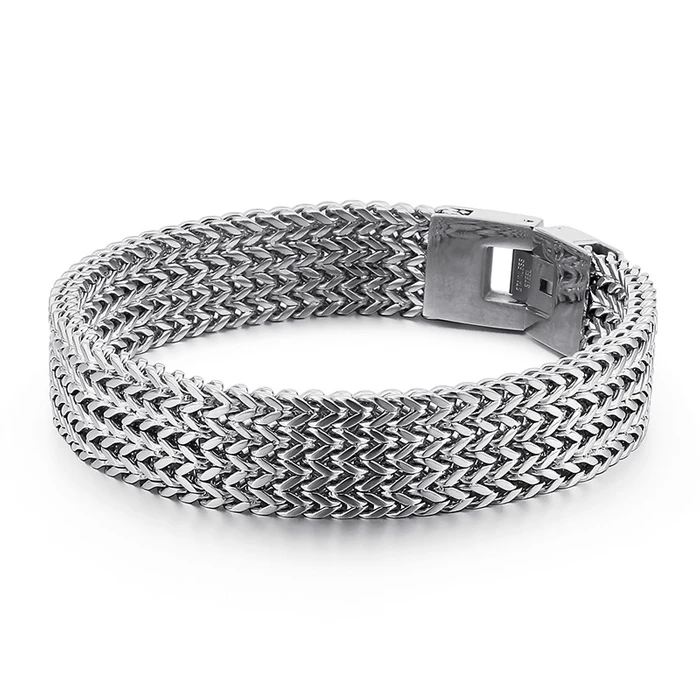 Moderný náramok z chirurgickej ocele zložený zo štyroch radov. Náramok má leštený povrch, zapínanie náramku je na klip. Šírka náramku 13mm, dĺžka 20,5 cm.