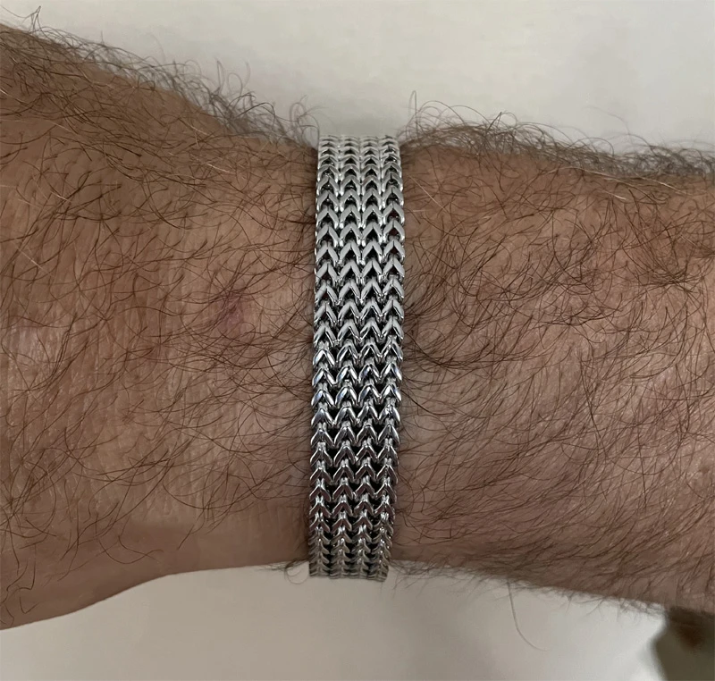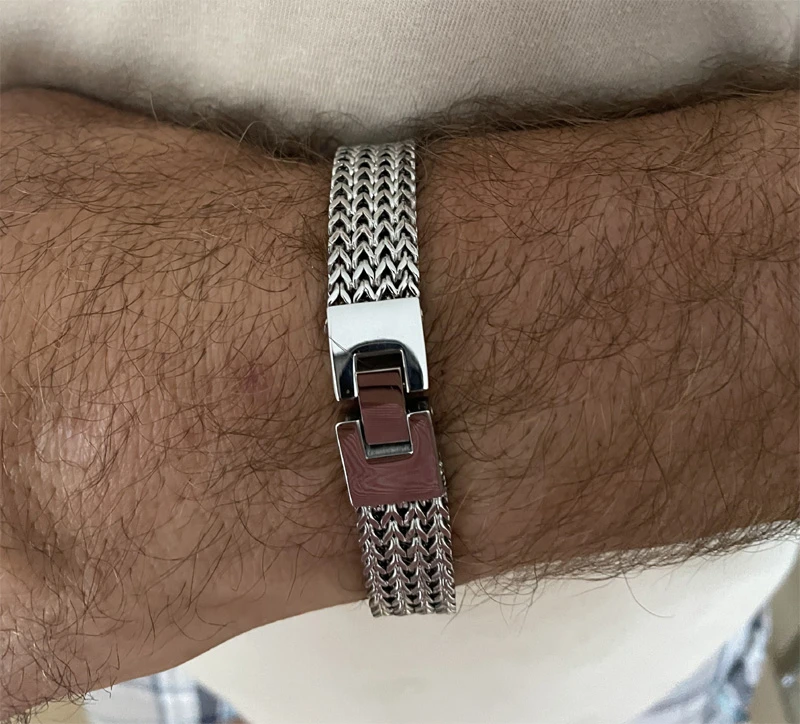 Oceľový náramok na ruku. Ako všetky šperky zhotovené z materiálu chirurgická oceľ, je aj tento náramok odolný proti poškodeniu, nevyvoláva magnetické reakcie, neoxiduje, chirurgická oceľ nemení farbu. Vďaka týmto vlastnostiam a prijateľnej cene sa oceľové šperky tešia stále značne vysokej popularite v stále sa rozširujúcich radoch spokojných užívateľov.