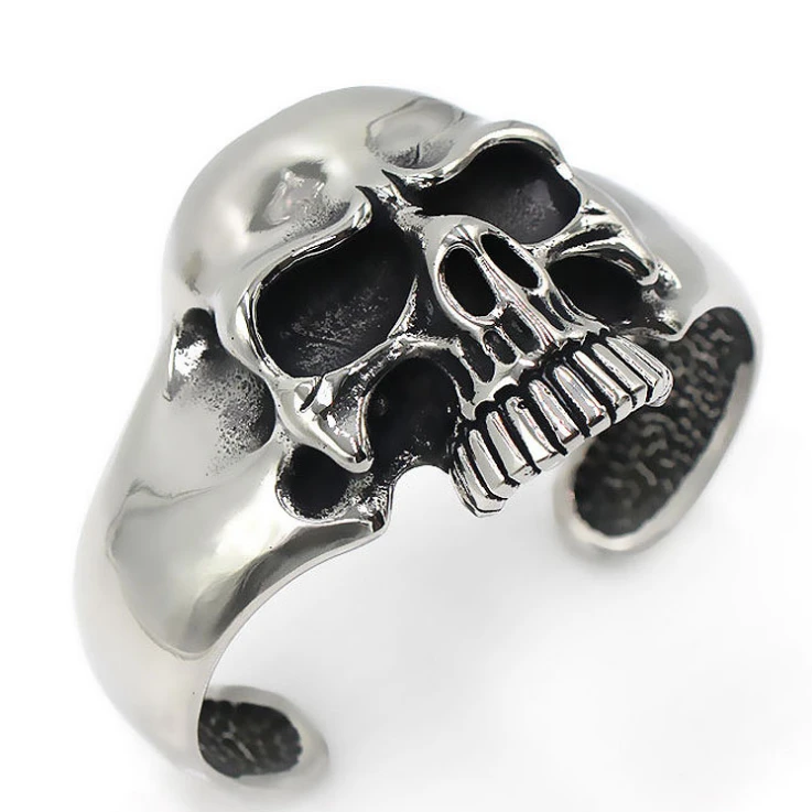 Oceľový pevný náramok s lebkou. Ako všetky oceľové šperky je aj tento pevný náramok s lebkou odolný proti poškodeniu, neoxiduje, nemení farbu ani nevyvoláva alergické reakcie.