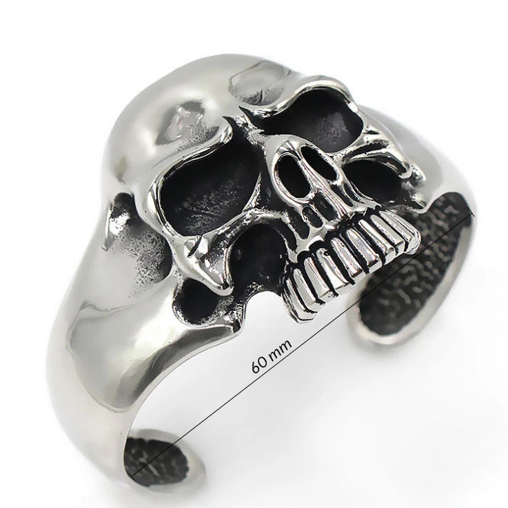 Pevný náramok z chirurgickej ocele s lebkou. Povrch náramku je leštený, lebka je čiastočne zvýraznená čiernou farbou. Rozmer lebky 42x40 mm. Vnútorný priemer náramku 60 mm.
