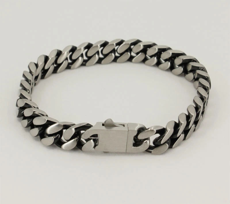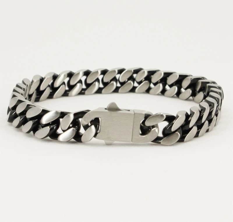 Štýlový oceľový náramok na ruku. Povrch náramku je kombinácia matnej úpravy a čiernej farby. Dĺžka náramku 21cm, šírka 9mm. Náramkové zapínanie je na bajonet.
