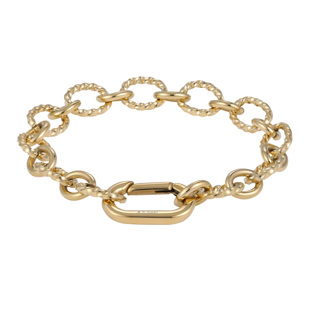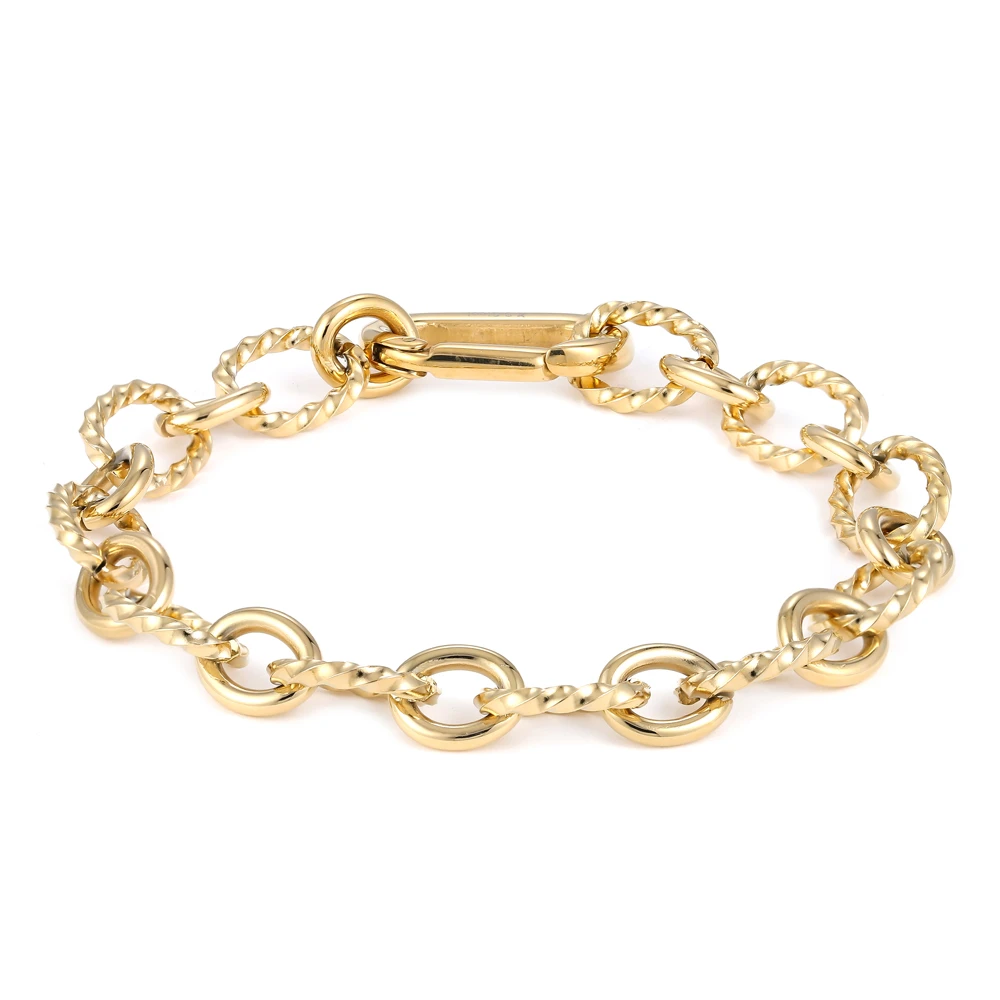 Dámsky pozlátený náramok z chirurgickej ocele. Náramok je pozlátený žltým zlatom technológiou PVD. Hladké očká náramku sú široké 8mm, vzorované očká sú široké 10mm. Ozdobné zapínanie má rozmer 22x13mm. Na prianie je možné dĺžku náramku zadarmo skrátiť.