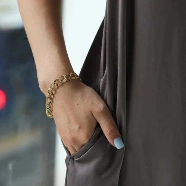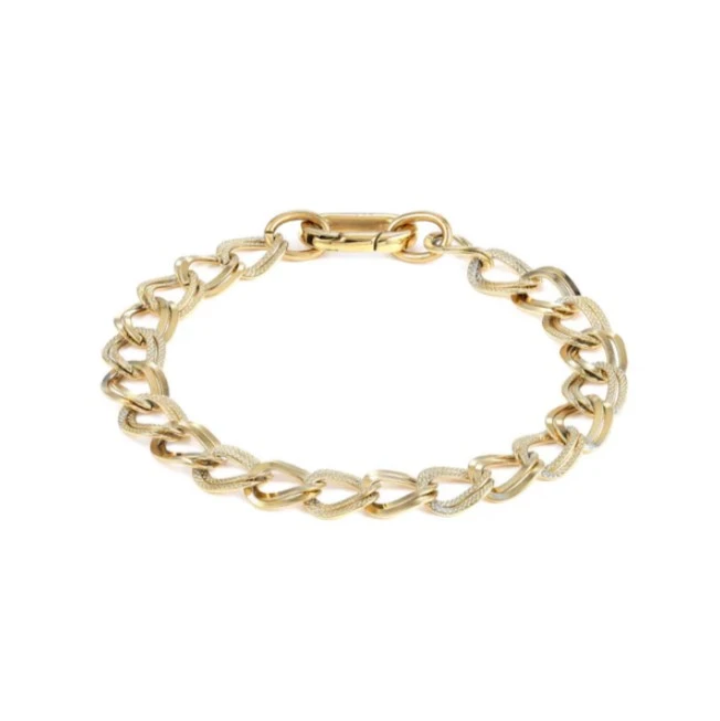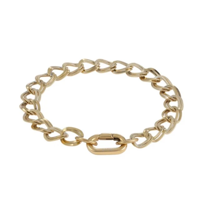 Dámsky náramok z chirurgickej ocele s pozláteným povrchom. Očká náramku majú rozmer 8x10mm. Elegantný nadčasový náramok, ktorý vďaka kvalitnej chirurgickej ocele vydrží dlhú dobu. Náramkové zapínanie je karabínové. Dĺžka náramku 19cm.