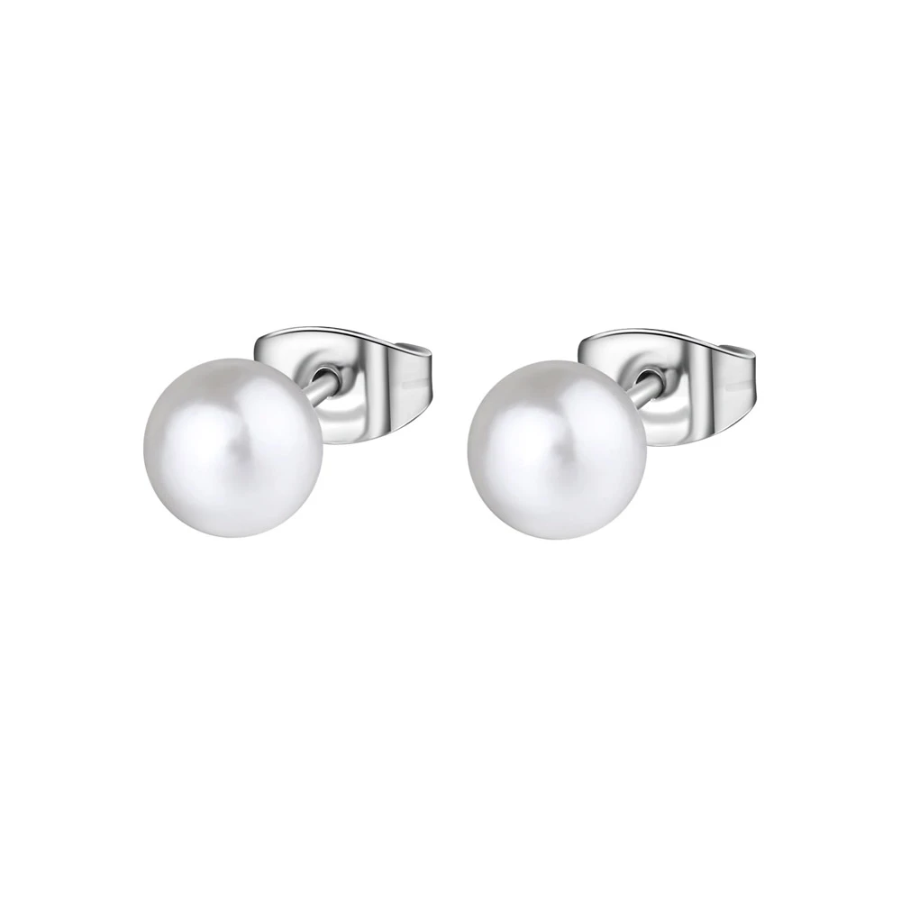 Náušnice kôstky z chirurgickej ocele zdobené umelými perlami. Náušnicové zapínanie je na puzetky, priemer perál 6mm.