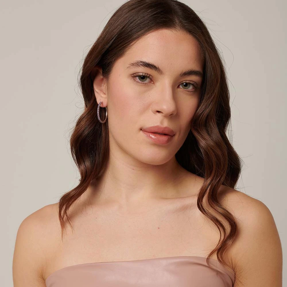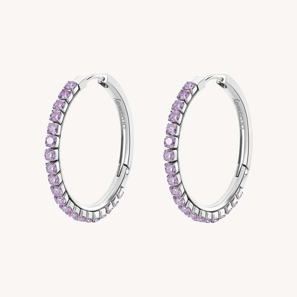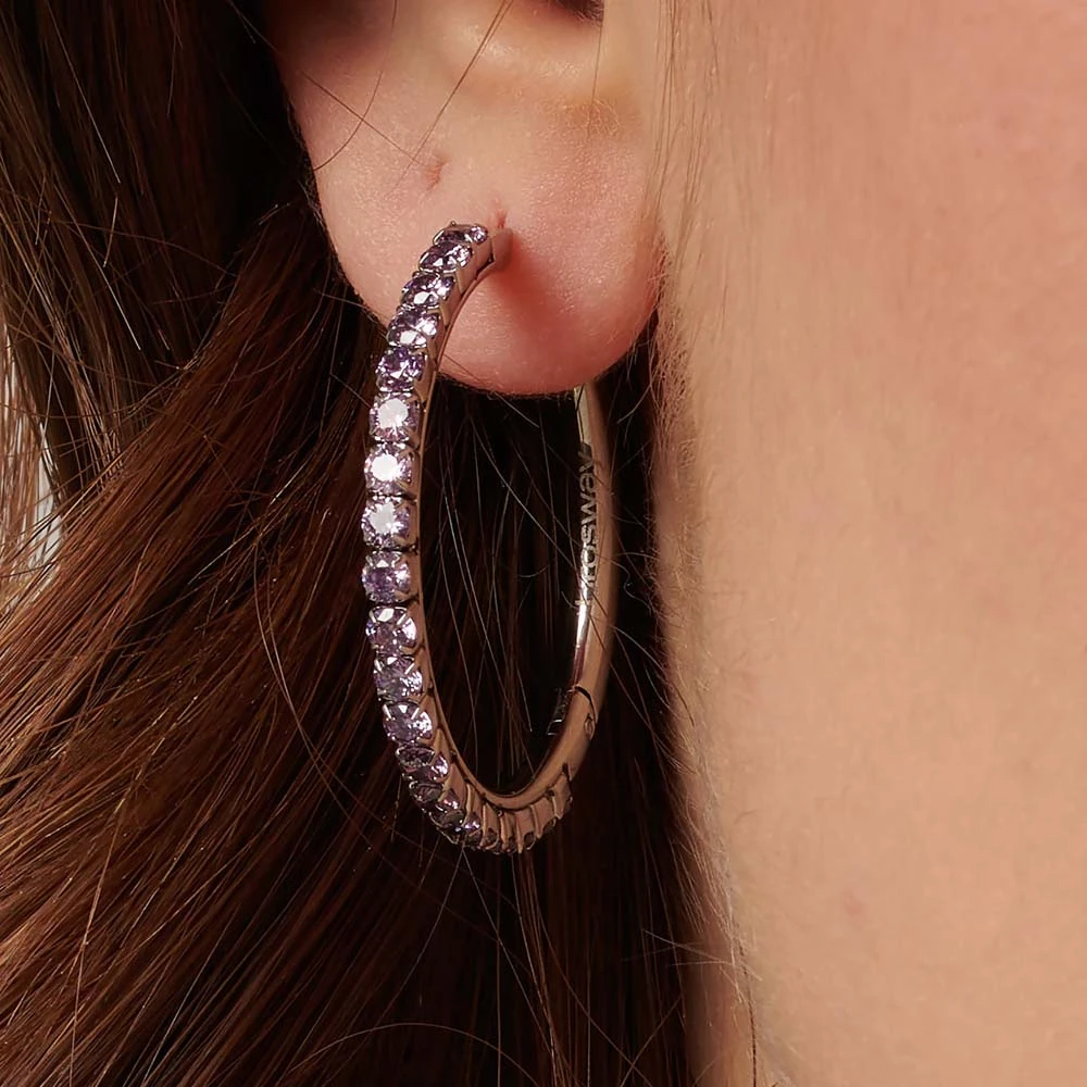 Kruhové náušnice so zirkónmi z chirurgickej ocele. Povrch náušníc je leštený, zdobený fialovými zirkónmi. Náušnicové zapínanie je kĺbové. Priemer náušníc 32mm.