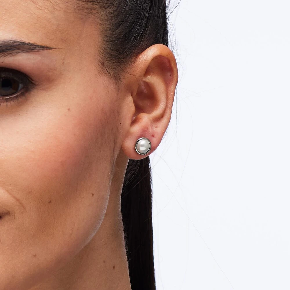 Náušnice z chirurgickej ocele kôstky. Povrch náušníc je leštený. Náušnice sú osadené imitáciou perly. Priemer náušníc 9 mm. Náušnicové zapínanie je na puzetky.