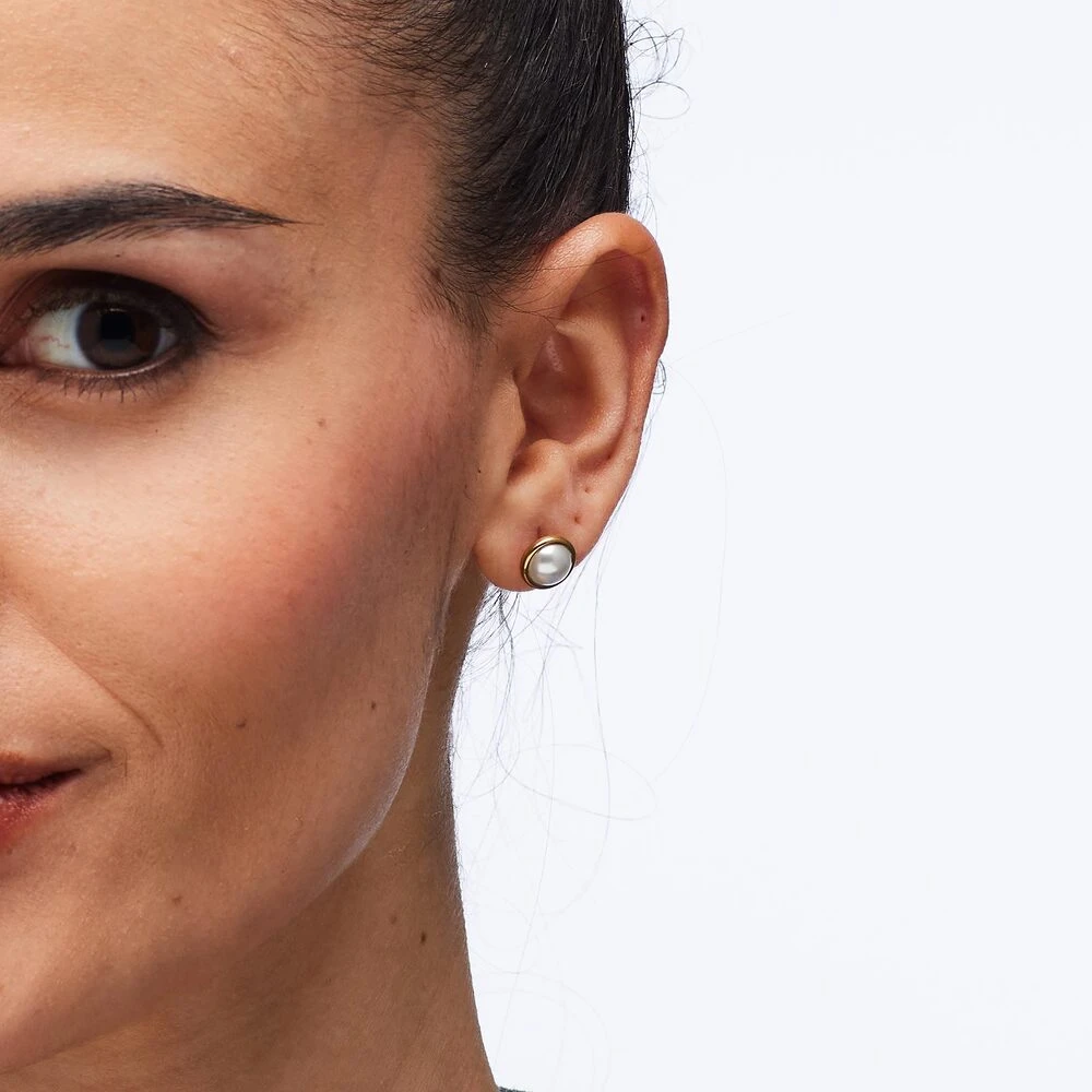 Náušnice z chirurgickej ocele. Povrch náušníc je pozlátený žltým zlatom technológiou PVD. Náušnice sú osadené umelou perlou. Priemer náušníc 9 mm. Náušnicové zapínanie je na puzetky.