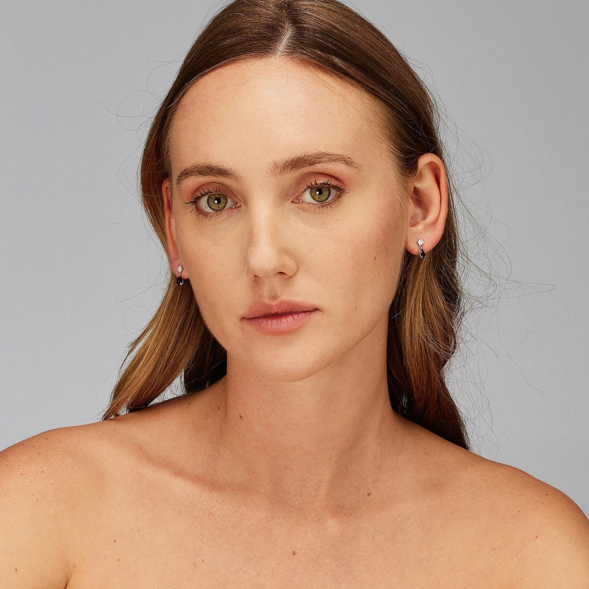 Náušnice visiace vyrobené zo striebra 925/1000. Náušnice sú osadené prvotriednymi zirkónmi. Povrch striebra je porhodiovaný. Nanesené ródium zamedzuje prirodzenej oxidácii striebra, potláča alergické reakcie a zaisťuje tak náušniciam dlhodobý bezchybný vzhľad a ich bezproblémové nosenie. Náušnice sú dlhé 12mm. Náušnicové zapínanie je na puzetky.