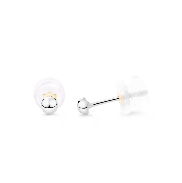 Zlaté náušnice kôstky z bieleho zlata rýdzosti 585/000. Priemer ozdoby 3mm. Náušnicové zapínanie je na zlaté puzetky zaliate v silikónu.
