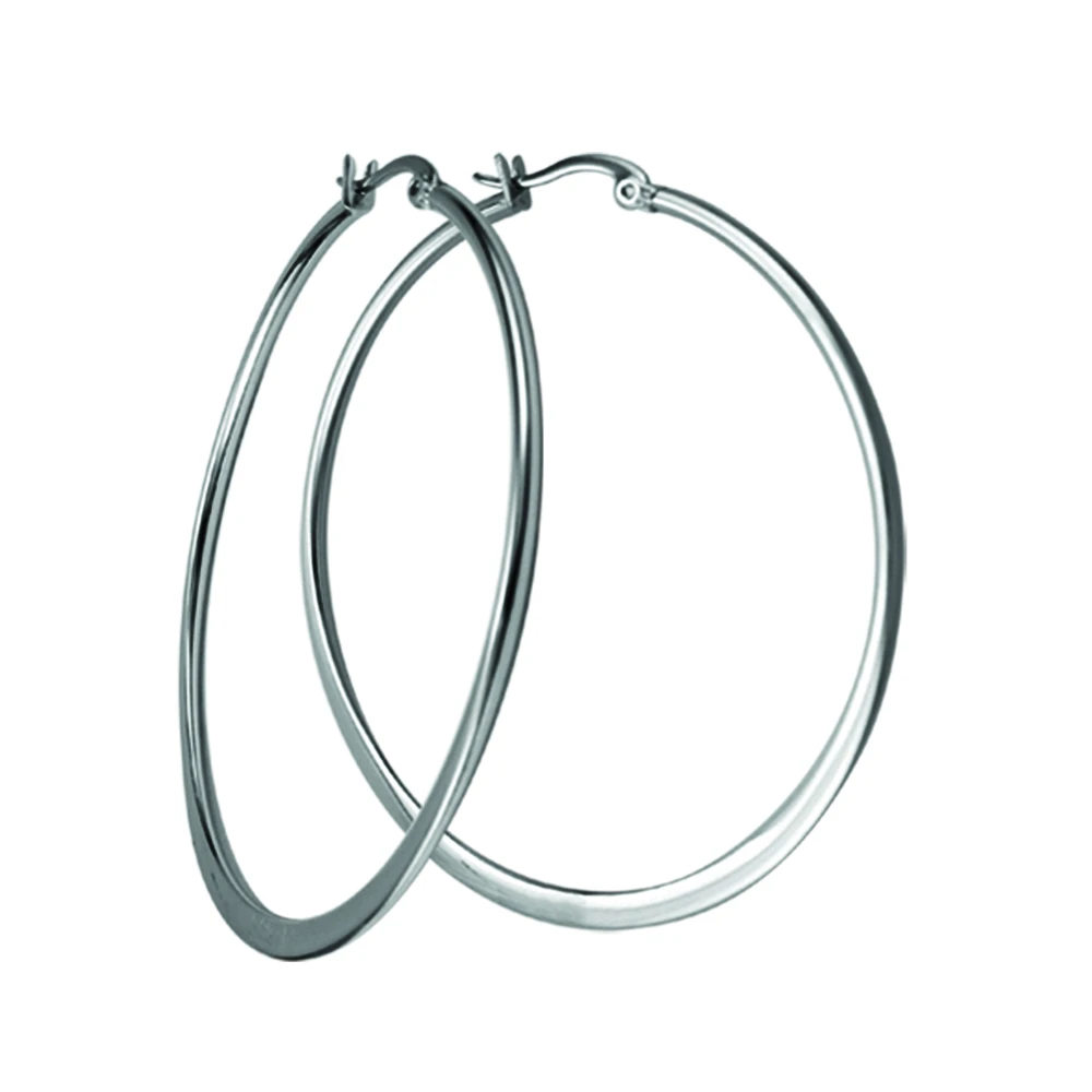 Kruhové náušnice z chirurgickej ocele. Povrch náušníc je leštený. Náušnice majú vonkajší priemer 55mm. Náušnicové zapínanie je na francúzsky zámok.