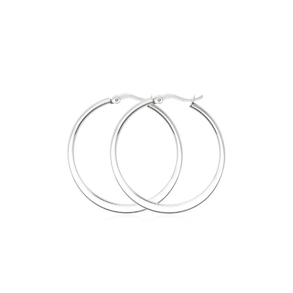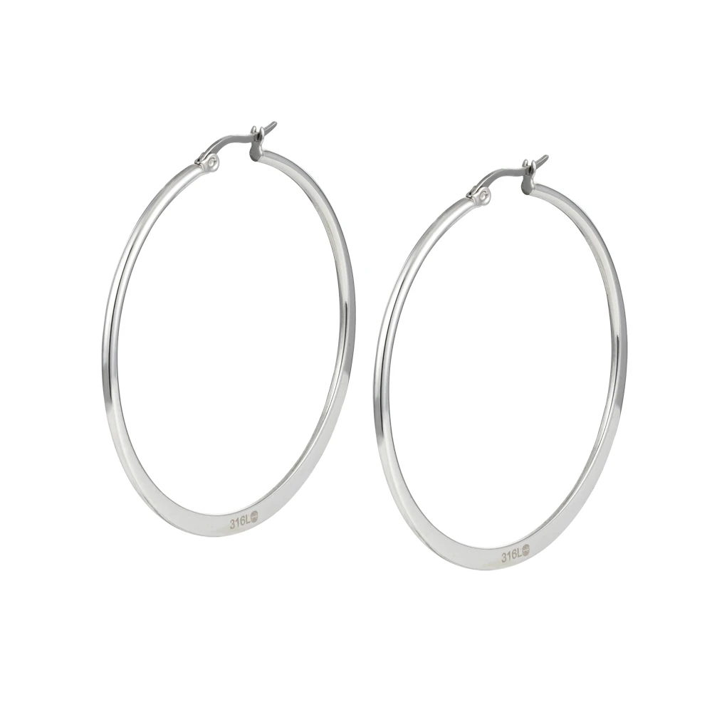 Kruhové náušnice z chirurgickej ocele. Povrch náušníc je leštený. Náušnice majú vonkajší priemer 32mm. Náušnicové zapínanie je na francúzsky zámok.