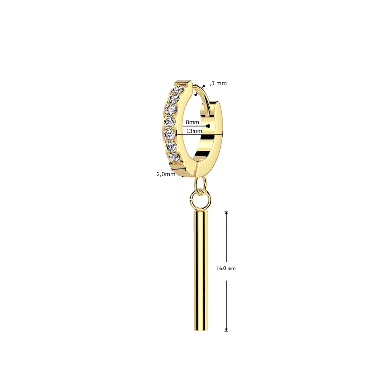Náušnice z chirurgickej ocele krúžky. Náušnice sú ozdobené prvotriednymi zirkónmi. Povrch náušníc je leštený. Vonkajší priemer krúžkov 13mm, vnútorný priemer 8mm, šírka náušníc 2mm, celková dĺžka náušníc 33mm. Náušnicové zapínanie je kĺbové. Uvedené rozmery náušníc nájdete zobrazené na podpornej fotografii.. Cena je uvedená za pár oceľových náušníc so zirkónmi.