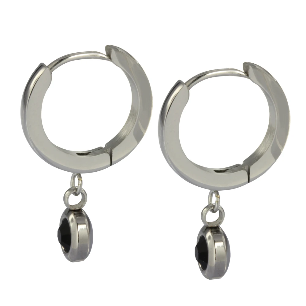 Náušnice z chirurgickej ocele ozdobené okrúhlym príveskom so zirkónom. Väčšie náušnice krúžky široké 2mm s vonkajším priemerom 16mm. Prívesok so zirkónom má priemer 6mm. Celková veľkosť náušníc 25mm. Náušnicové zapínanie je kĺbové.