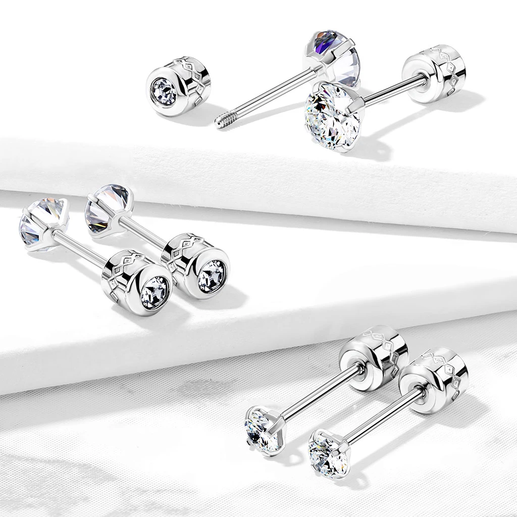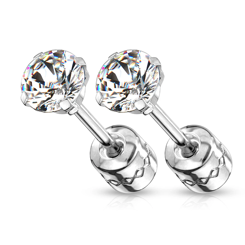 Náušnice na skrutku z chirurgickej ocele. Náušnice majú na skrutky kamienok. Skrutkovacie časť má priemer 4 mm. Kamienok je možné zvoliť v priemere 3,4,5 mm.