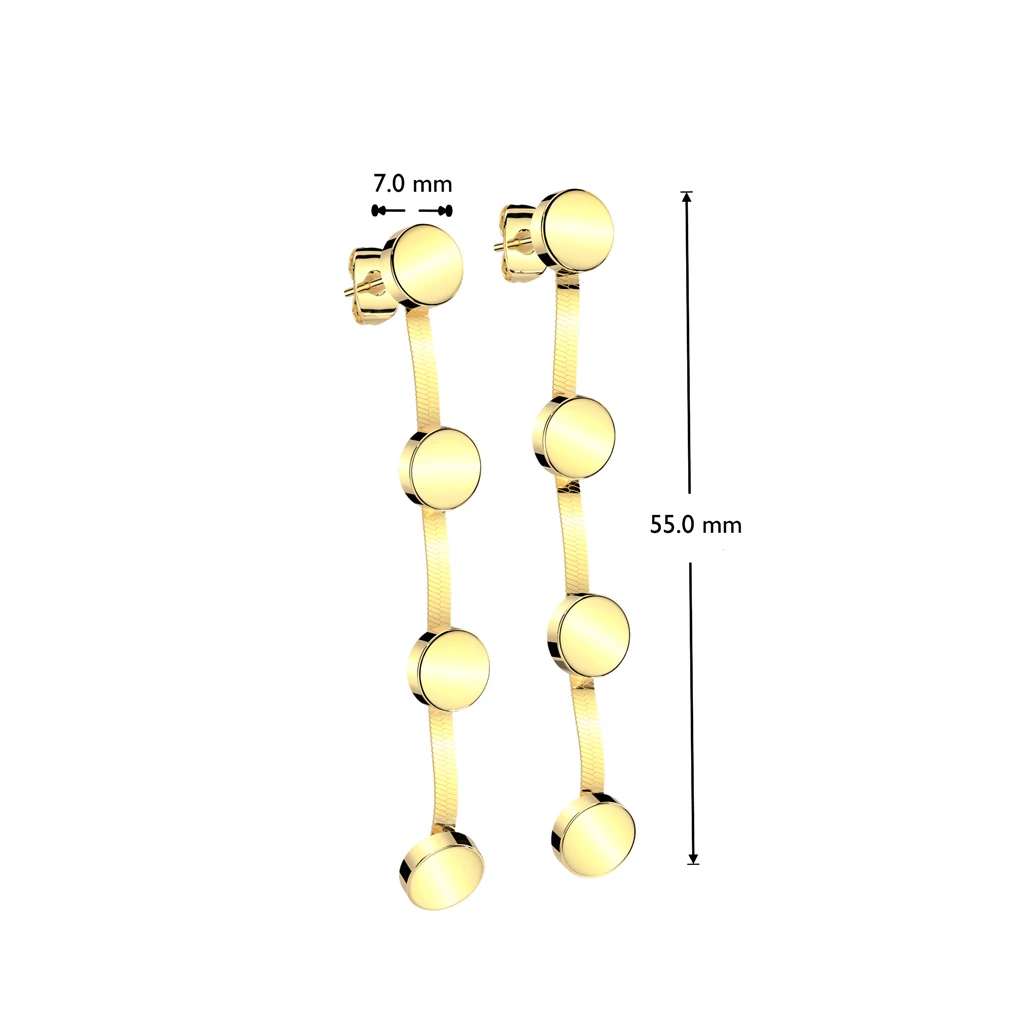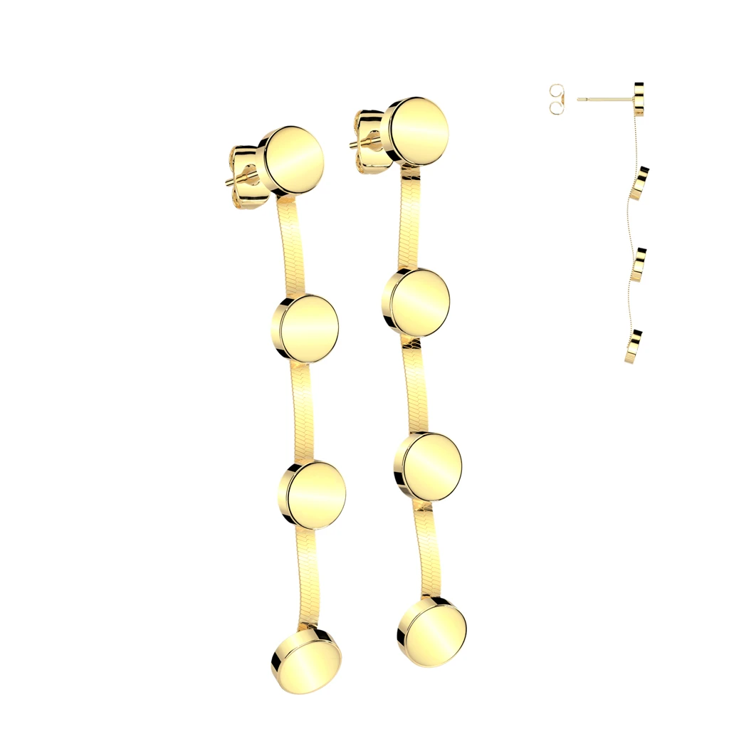 Visiace náušnice z chirurgickej ocele. Povrch náušníc je leštený. Okrúhle zdoby majú priemer 7mm, celková dĺžka náušníc 55mm. Náušnicové zapínanie je na puzetky. Cena je uvedená za pár.