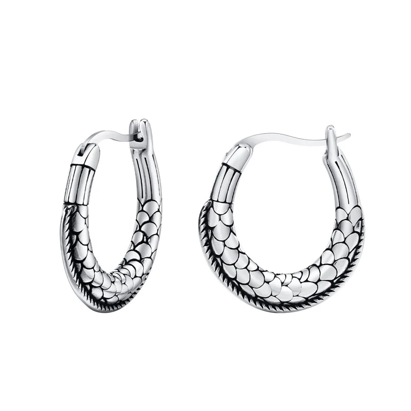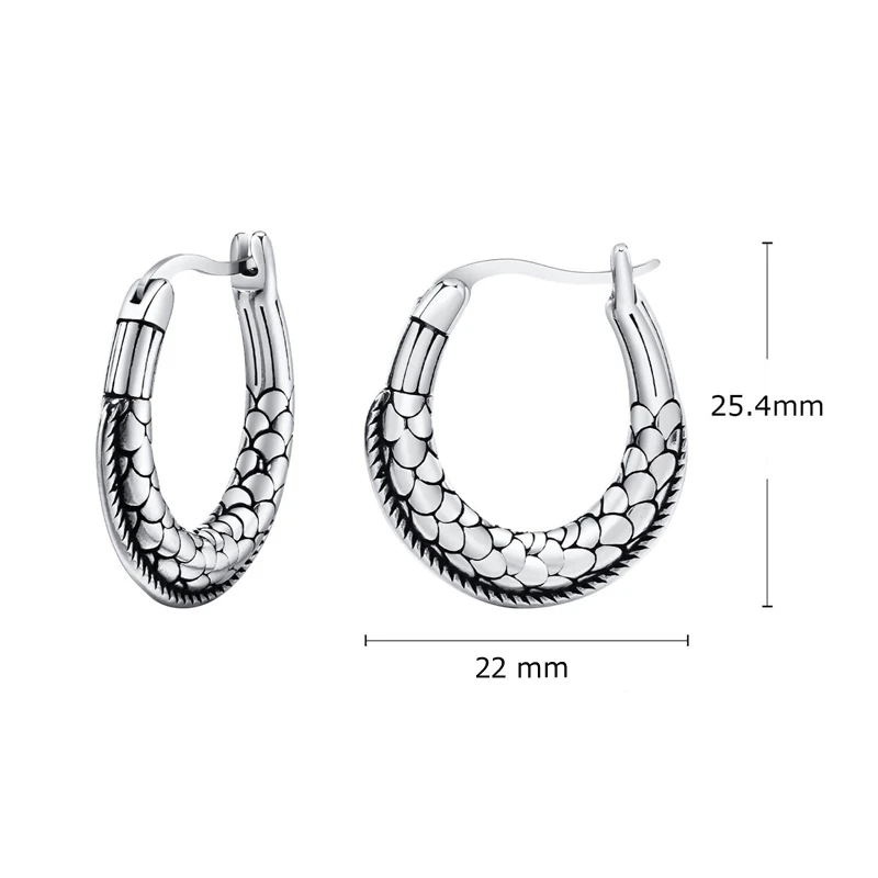 Visiace náušnice z chirurgickej ocele. Náušnice majú povrch ozdobený plastikou hadej kože. Náušnicové zapínanie je na francúzsky zámok. Rozmery náušníc 25x22mm nájdete zobrazené na podpornej fotografii.