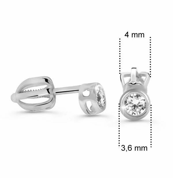 Zlaté náušnice kôstky so zirkónmi vyrobené z bieleho zlata rýdzosti 585/000. Zlaté kôstky s priemerom ozdoby 3,6 mm. Náušnicové zapínanie na je na skrutku. Priemer skrutkovacieho zapínanie 4 mm.