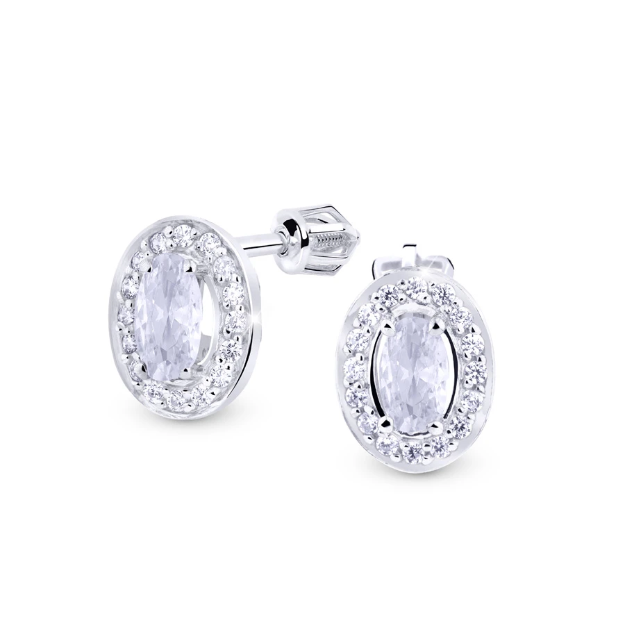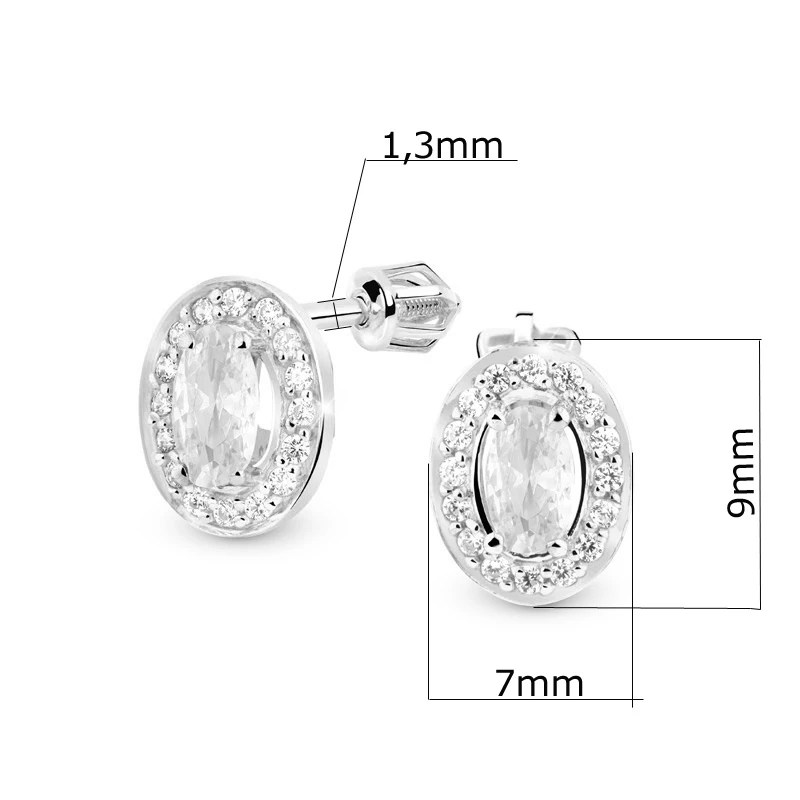 Zlaté náušnice so zirkónmi oválneho tvaru. Náušnice sú vyrobené z bieleho zlata 585/1000 a osadené prvotriednymi zirkónmi. tieto použité materiály vám zaručia nadčasovú eleganciu a žiarivý vzhľad náušníc po mnoho rokov. Náušnicové zapínanie je na skrutku. Výška náušníc 9mm, šírka 7mm.