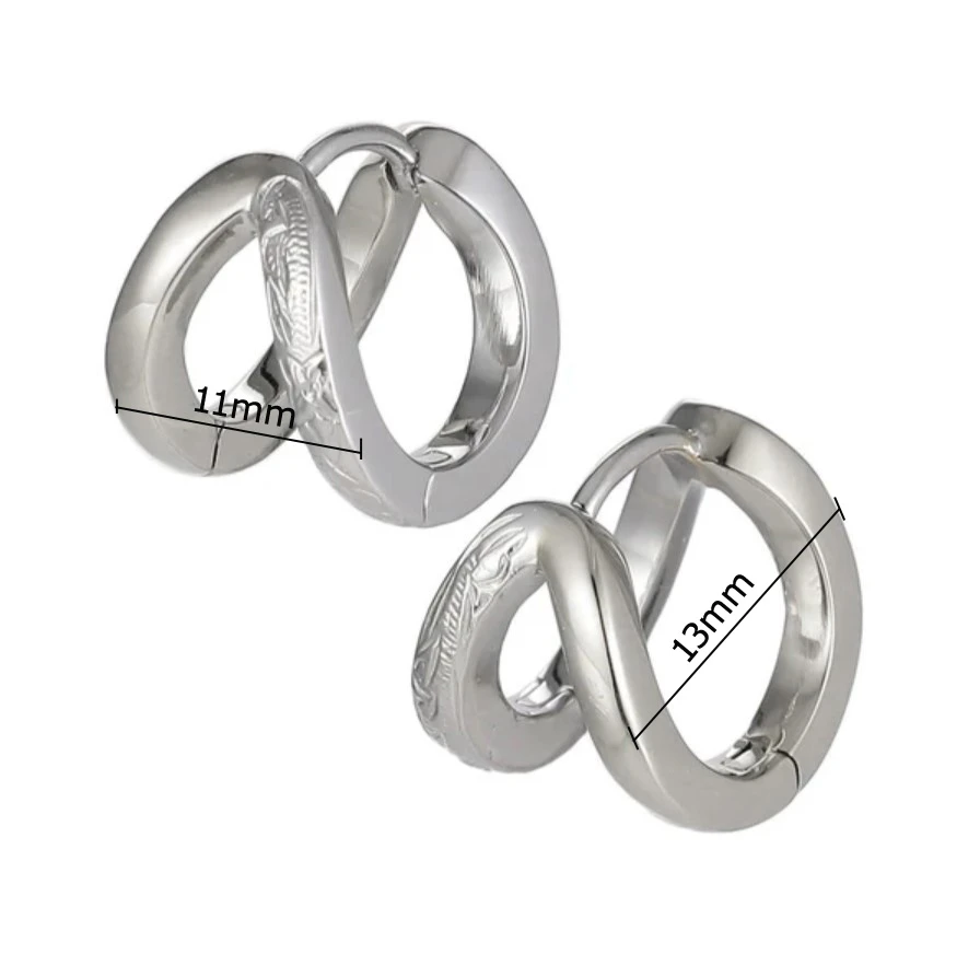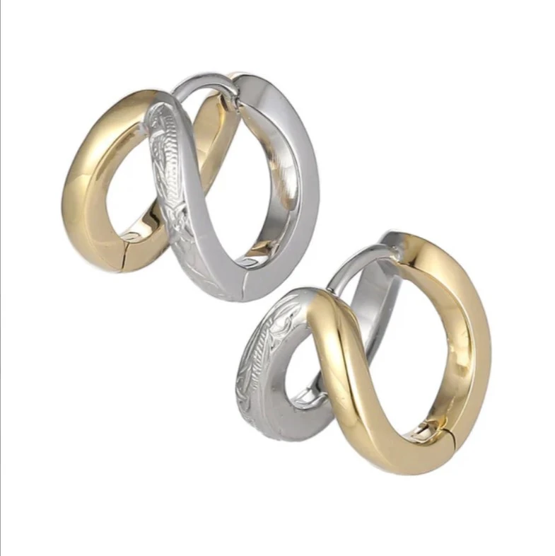 Náušnice z chirurgickej ocele tvorené dvoma spojenými krúžkami. Jeden krúžok má pozlátený povrch technológiou PVD, druhý krúžok je zdobený gravírovaním. Náušnice majú priemer 13mm, šírka v najširšom bode 11mm. Cena je uvedená za pár.