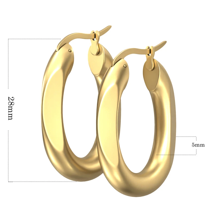 Visiace náušnice z chirurgickej ocele oválky. Povrch náušníc je matný, pozlátený technológiou PVD. Rozmer náušníc 28x5mm nájdete zobrazený na podpornej fotografii.